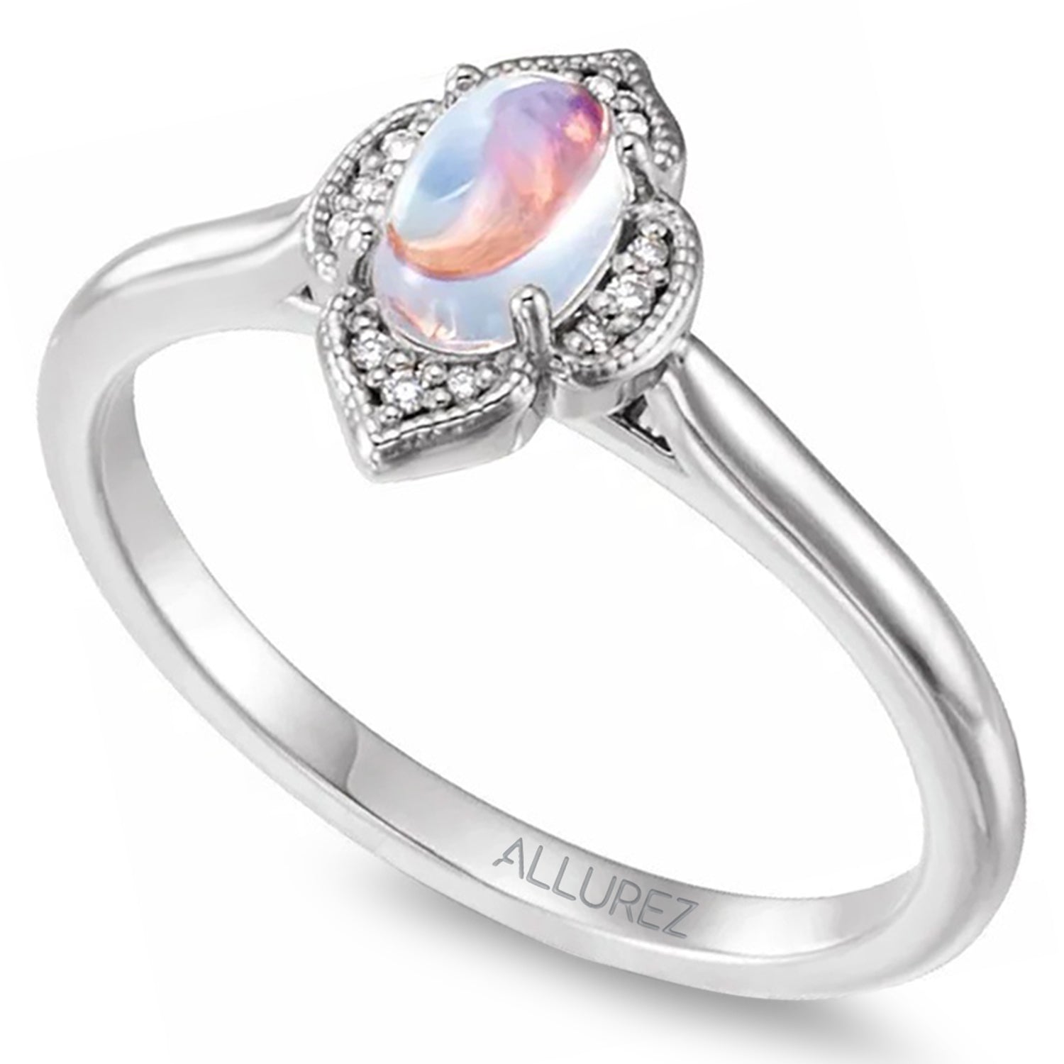 Natural Rainbow Moonstone & Diamond Clover Ring 14K White Gold (0.49ct)