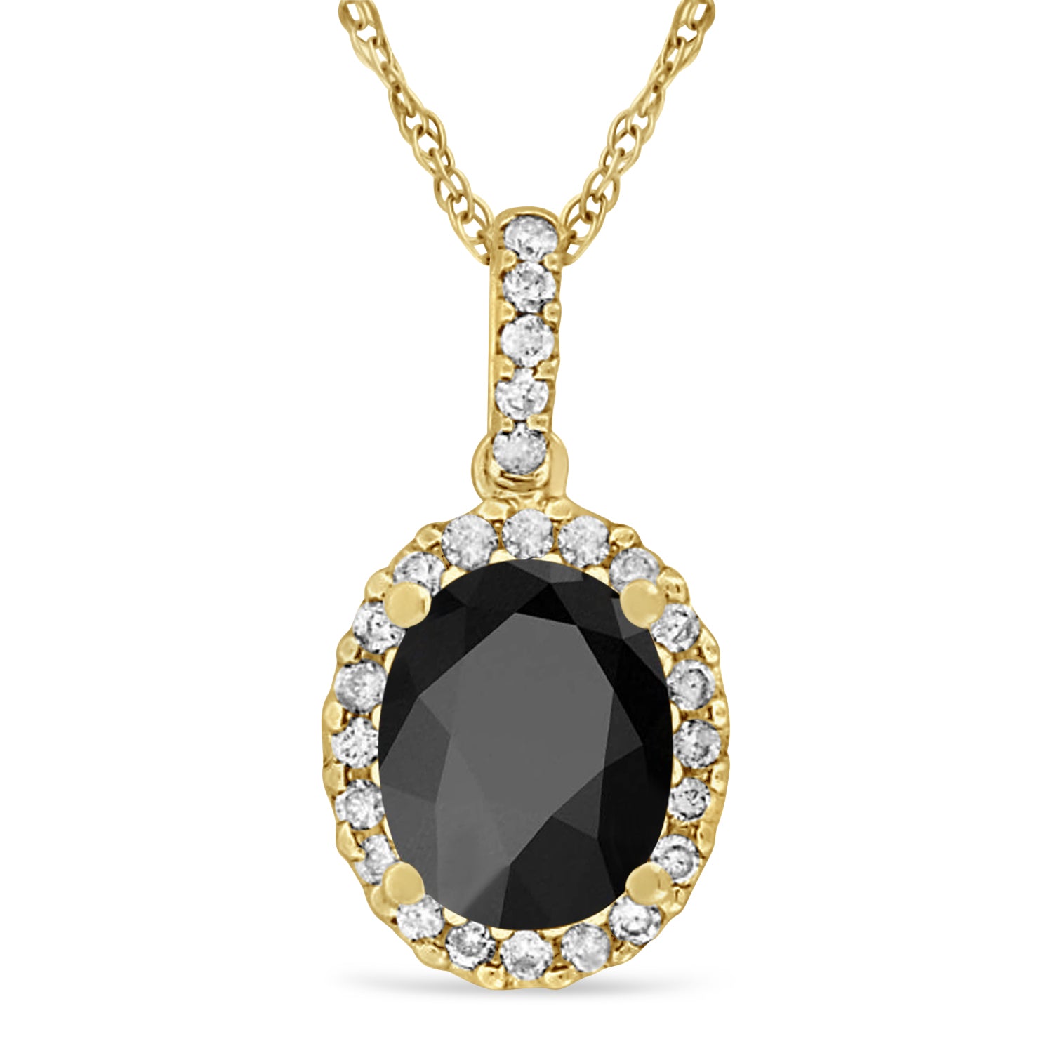 This pendant features an oval shaped diffused onyx framed by a diamond halo and diamond accents on the pendant loop. This pendant necklace is set in 14 yellow gold, has a total weight of about 2.14 total carats, and comes along with a 17 inch long chain.