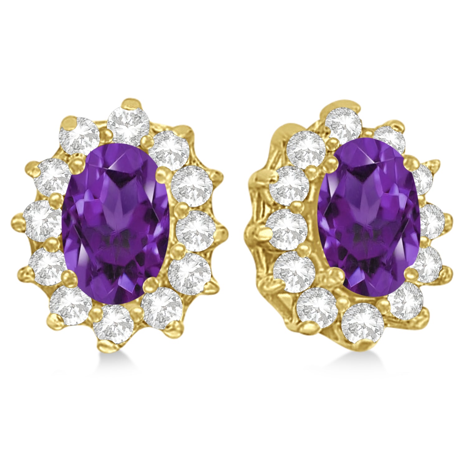 The earrings feature two oval shaped 6x4mm amethyst stones that weigh a total of 1.80 carats. Each amethyst center stone is surrounded by a halo of 12 round nearly colorless diamond stones, prong set, (24 total) that weigh a total of 0.25 carats.