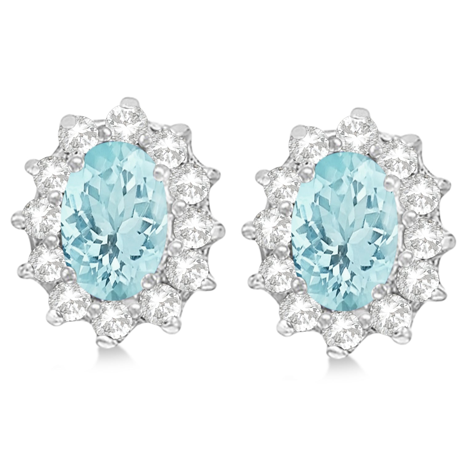 The earrings feature two oval shaped 6x4mm aquamarine stones that weigh a total of 1.80 carats. Each aquamarine center stone is surrounded by a halo of 12 round nearly colorless diamond stones, prong set, (24 total) that weigh a total of 0.25 carats.