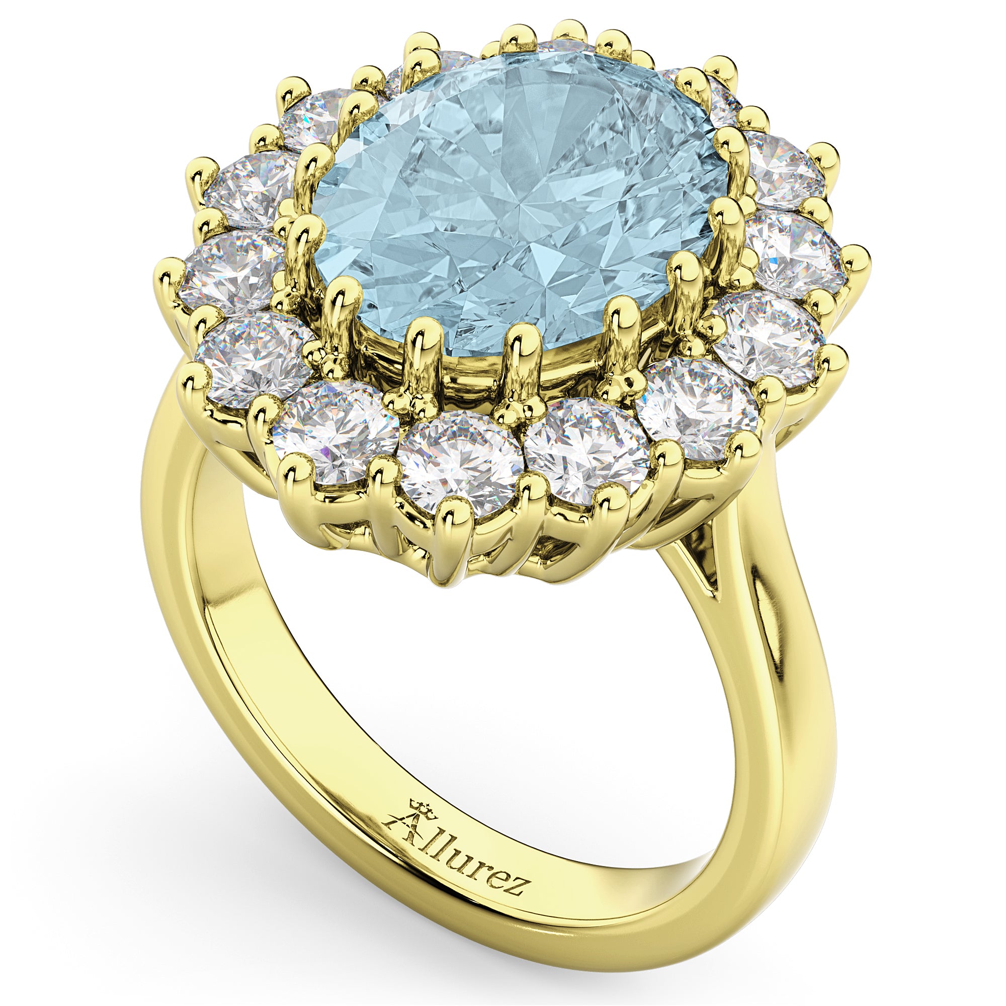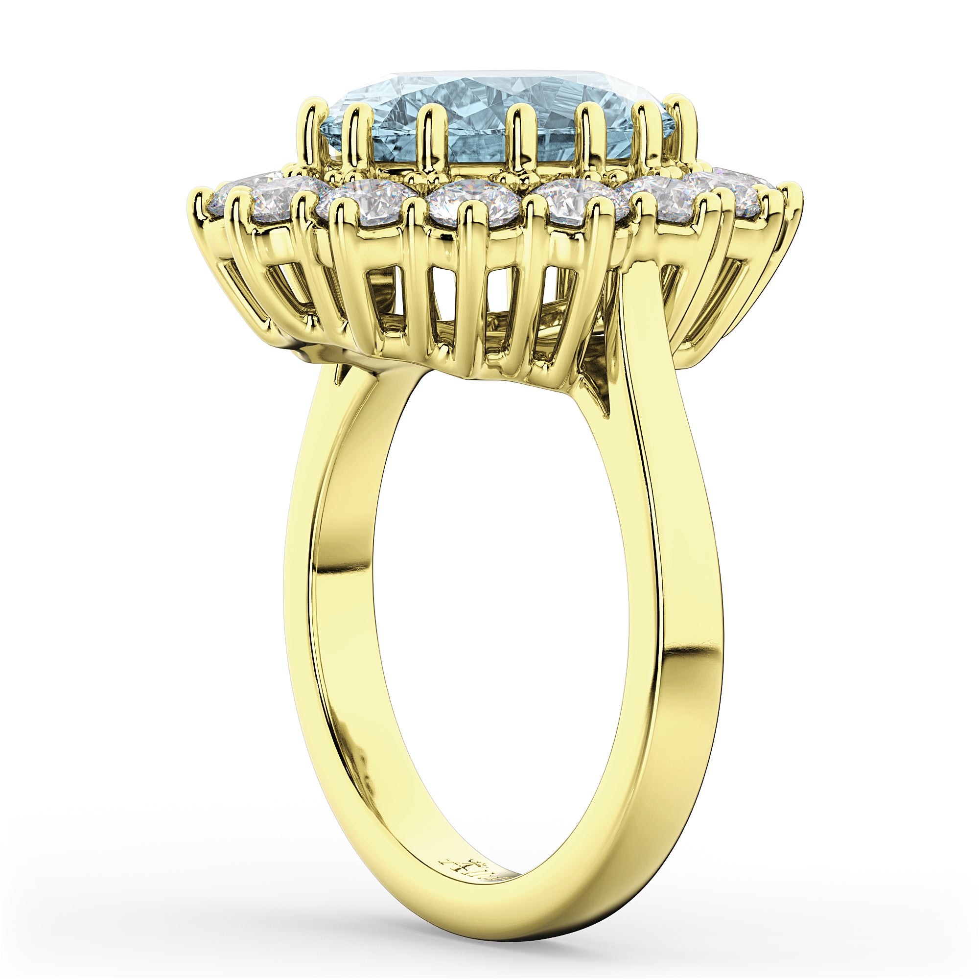Oval Aquamarine & Diamond Halo Lady Di Ring 18k Yellow Gold (6.40ct)