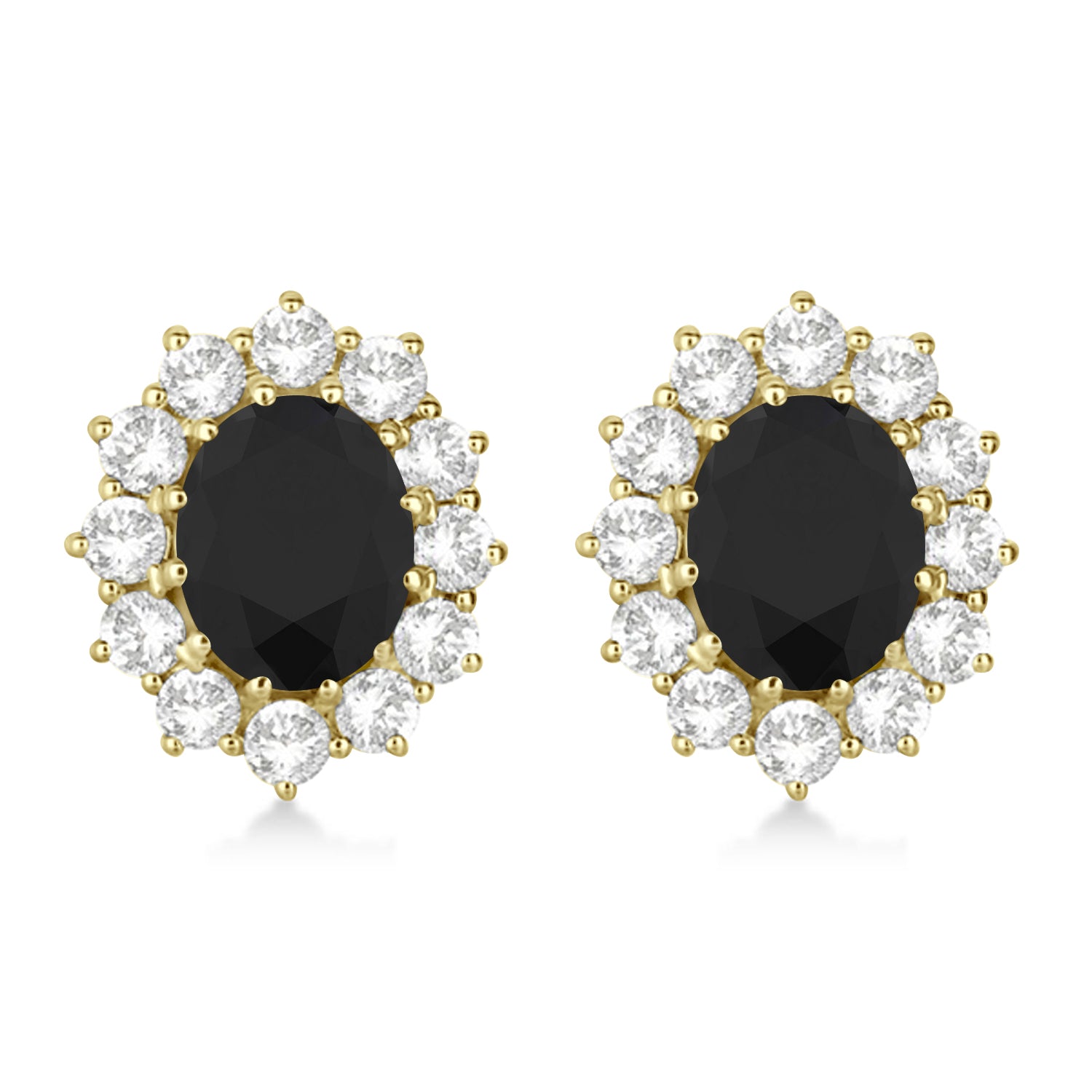Inspired by the ring worn by Lady Diana and Princess Kate Middleton, these gorgeous halo style ruby earrings with diamonds feature two 9x7mm oval shaped black diamonds accented by 24 brilliant-cut round diamonds.