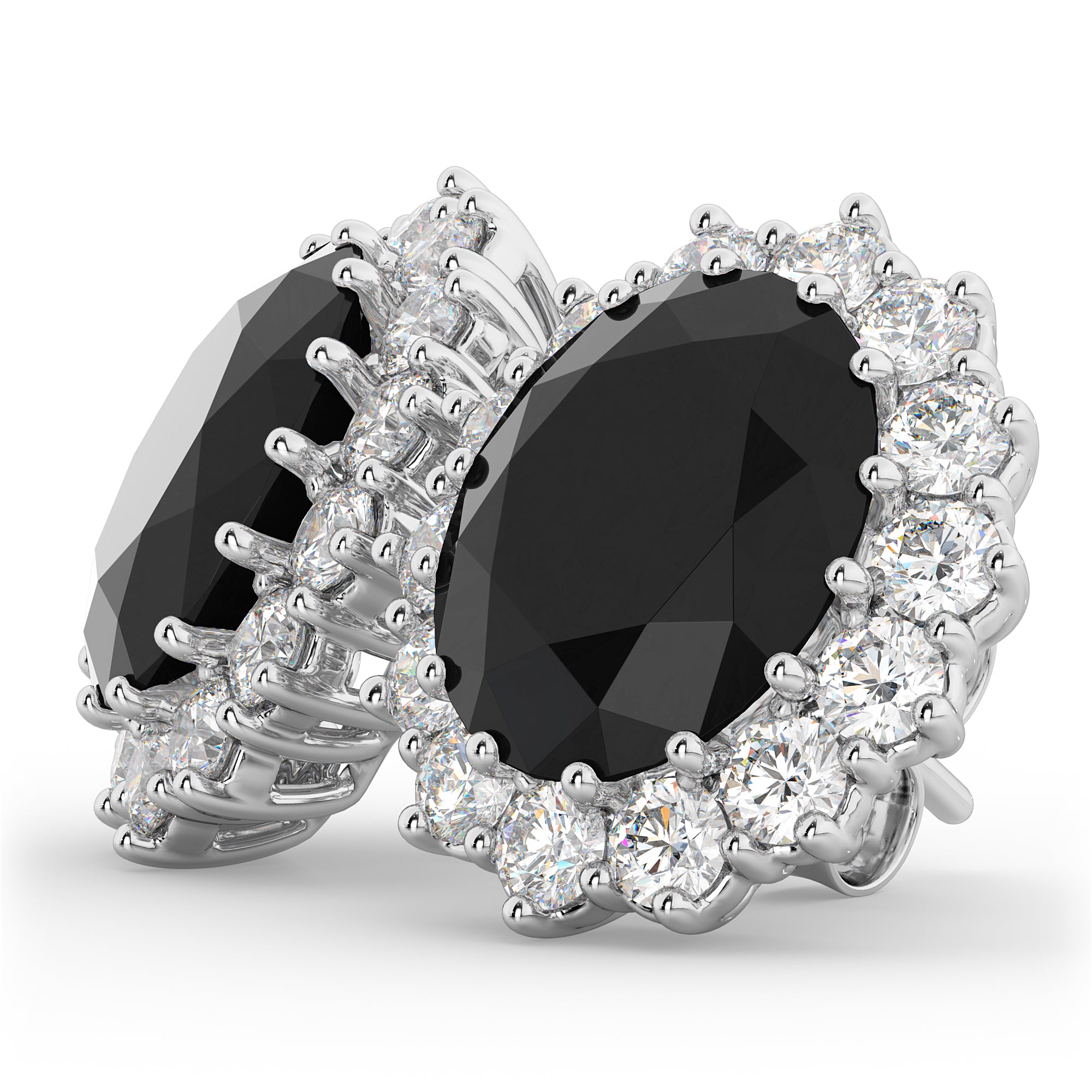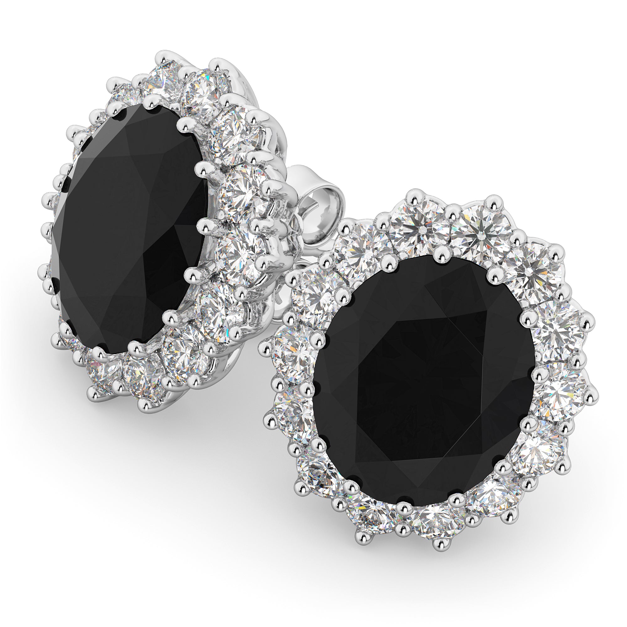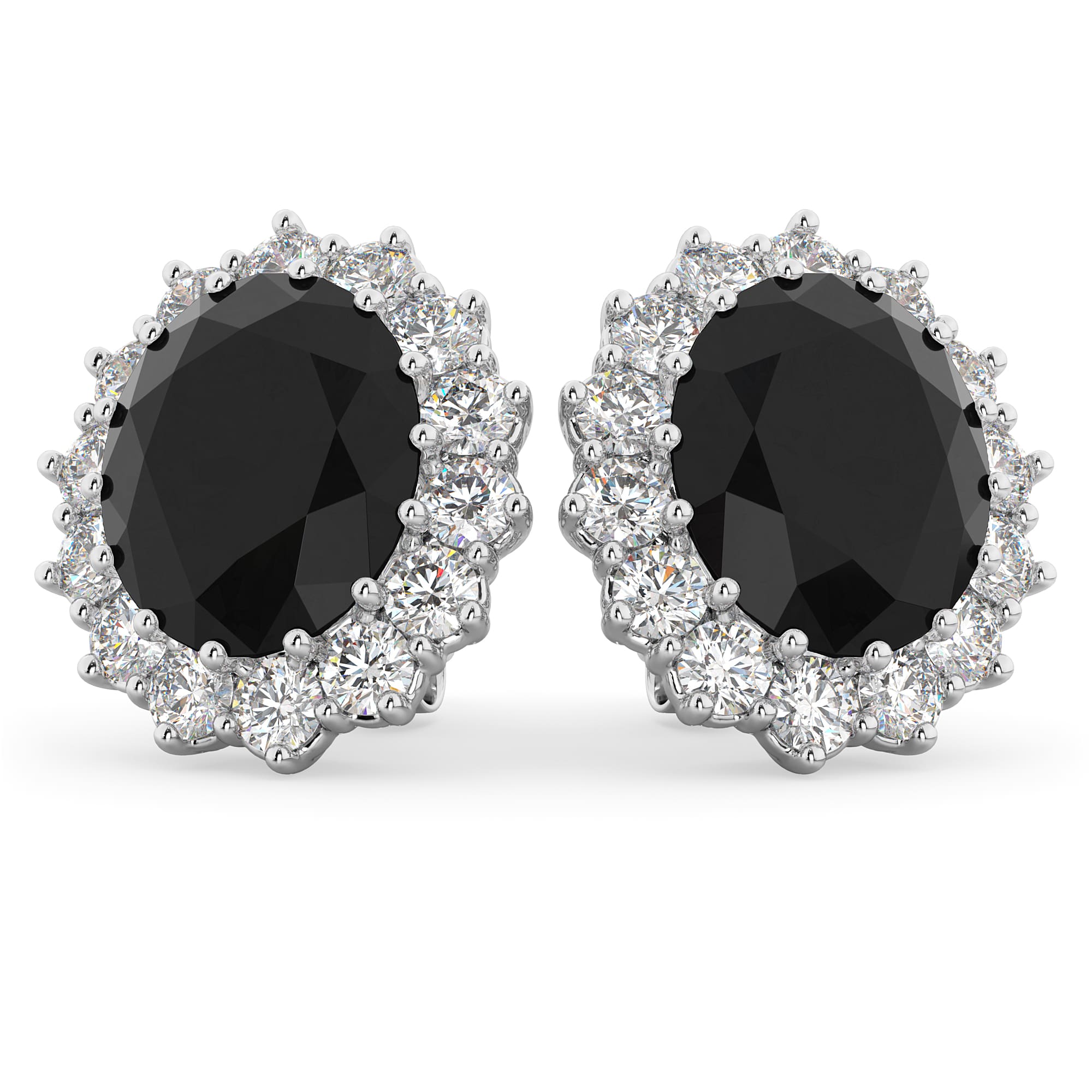 Inspired by the ring worn by Lady Diana and Princess Kate Middleton, these gorgeous precious black diamond earrings feature two AAA quality 11x9mm oval shaped black diamonds surrounded by 28 brilliant-cut round diamonds in a halo fashion.