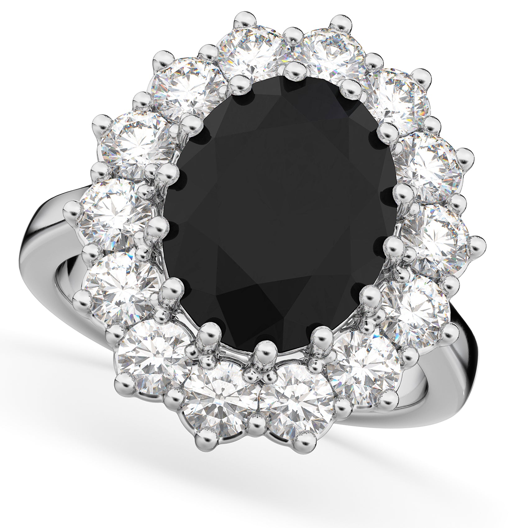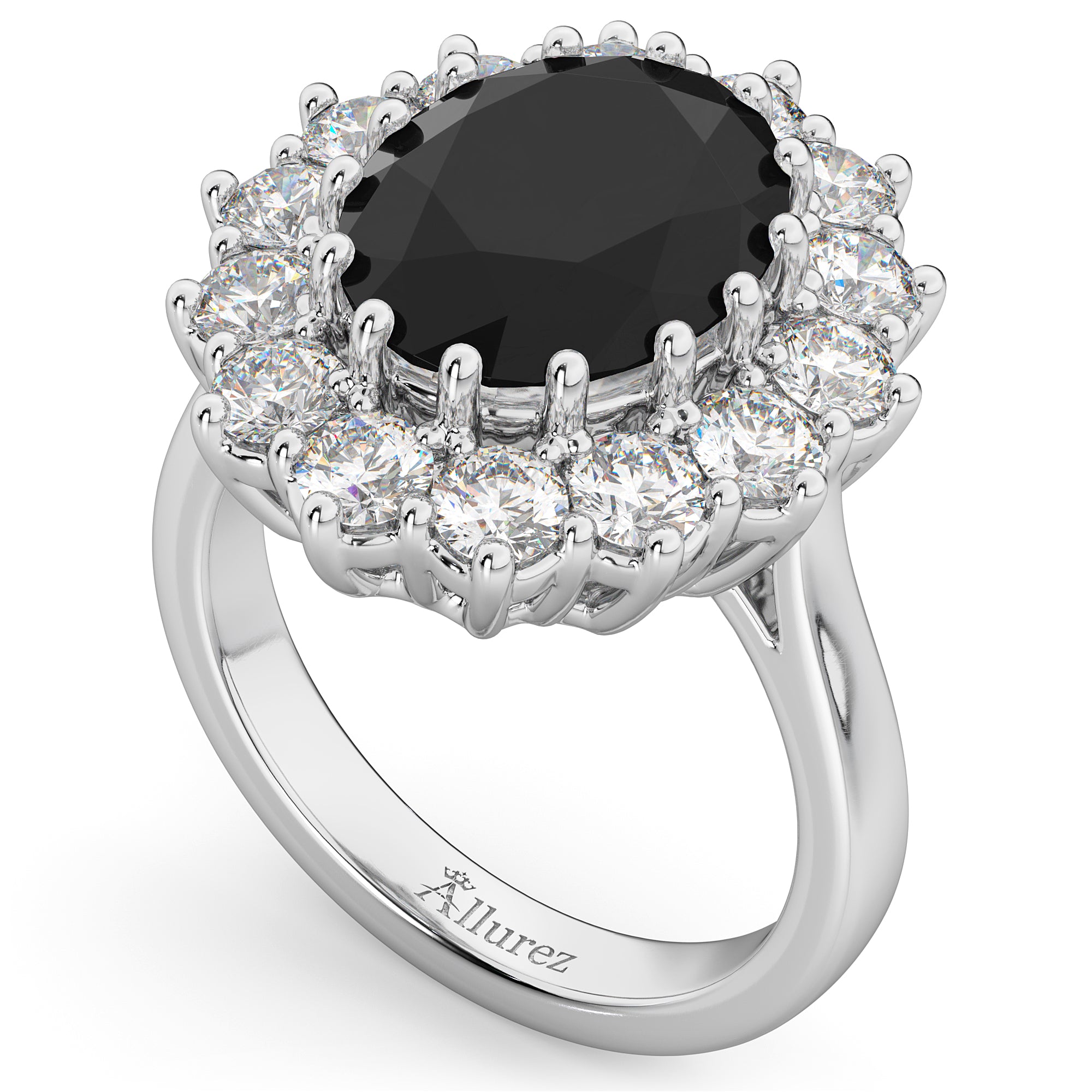 Oval Black Diamond & Diamond Halo Lady Di Ring 18k White Gold (6.40ct)
