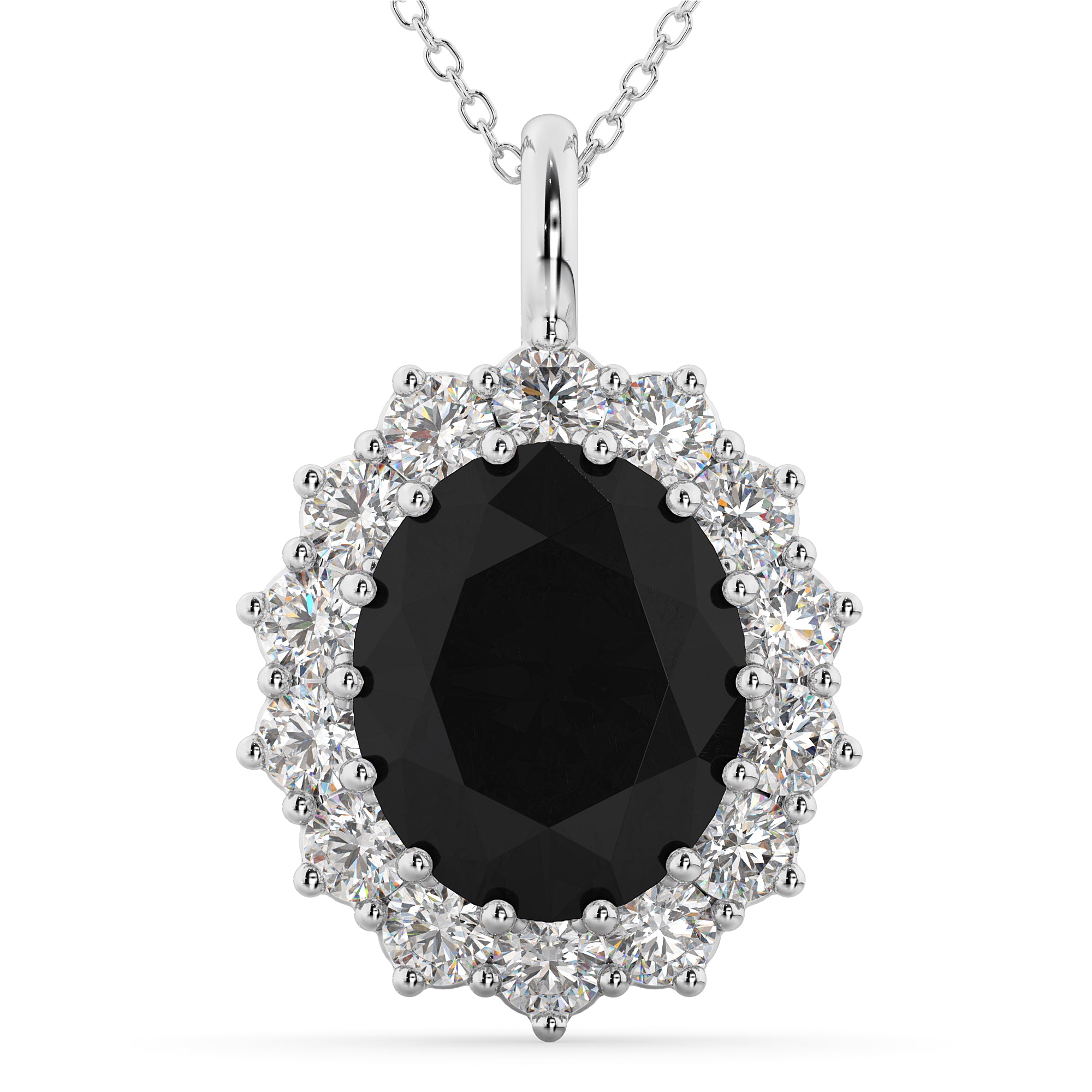 This prestigous diamond accented black diamond pendant necklace is inspired by the jewelry of Princess Diana and Princess Kate Middleton. This unique and luxurious ring makes a statement with its 12x10mm genuine and natural oval shaped black diamond that is complemented by 14 brilliant-cut round near-colorless diamonds of G-H Color, SI Clarity in an oval halo fashion. The black diamond and clear diamond stones rest on a remarkably stunning 14kt white gold setting.