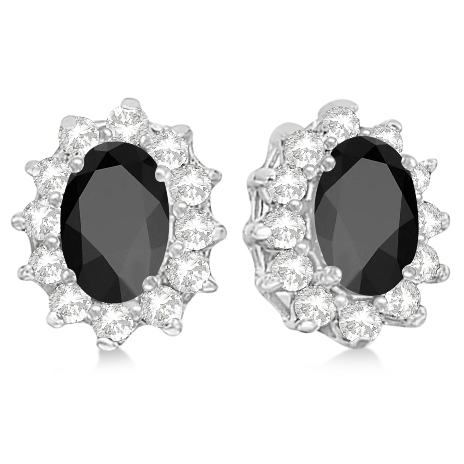 The earrings feature two oval shaped 6x4mm Black Onyx stones that weigh a total of 1.80 carats. Each Black Onyx center stone is surrounded by a halo of 12 round nearly colorless diamond stones, prong set, (24 total) that weigh a total of 0.25 carats.