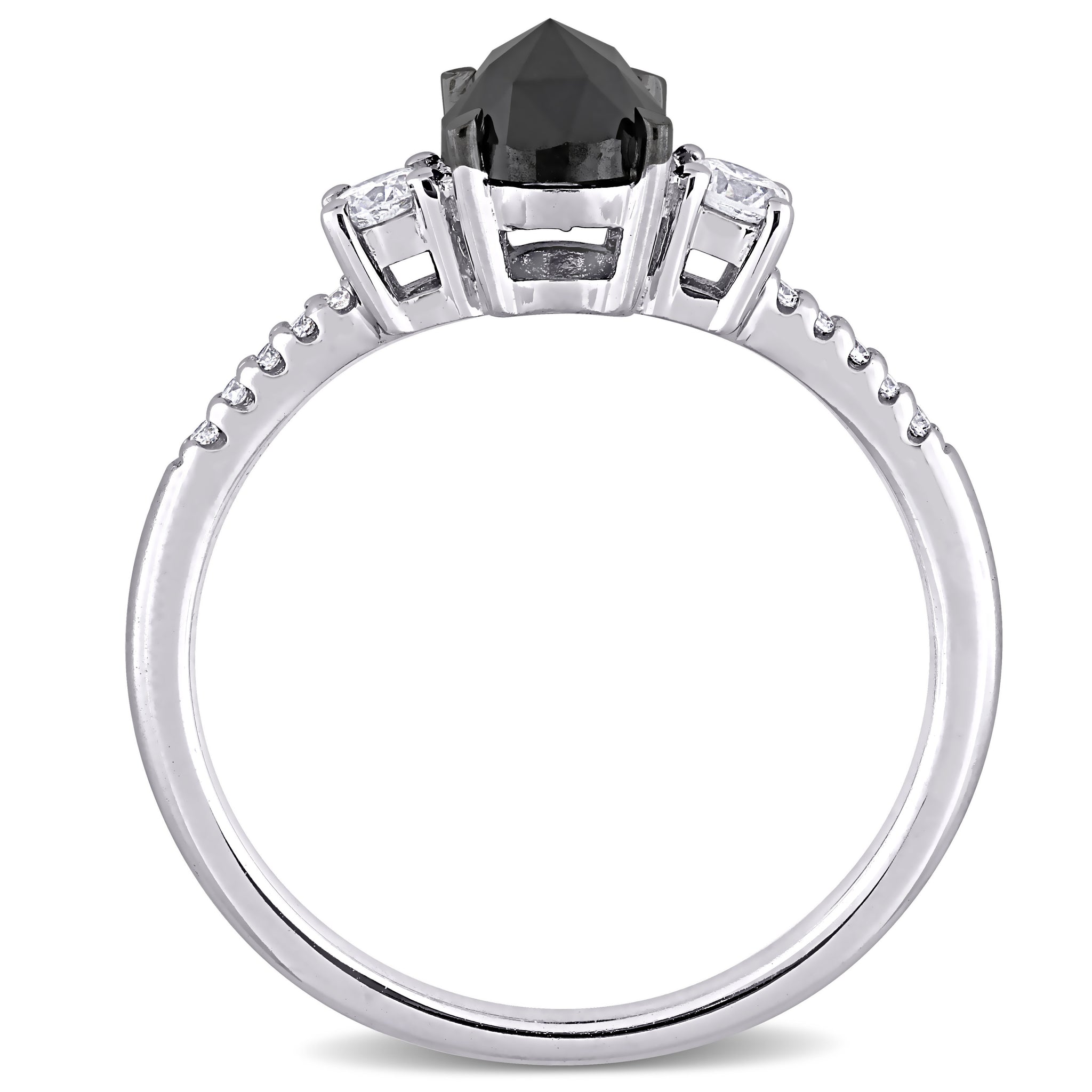 Impress your loved with this charming three-stone ring features an oval-cut prong-set black diamond center stone with two round white diamond side stones and accents crafted in 14k white gold.