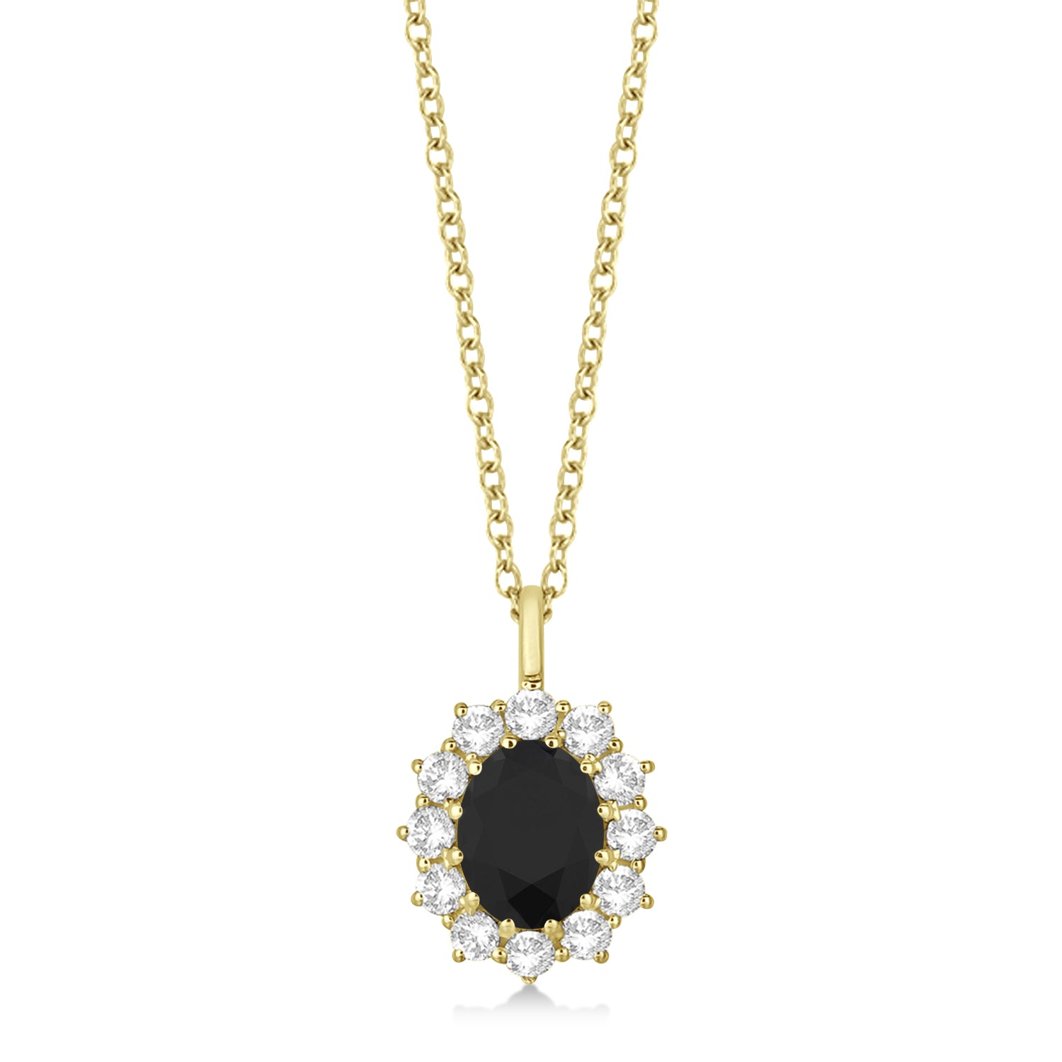 Inspired by jewelry worn by Lady Diana and Princess Kate Middleton, this gorgeous precious gemstone pendant necklace features an oval shaped 9x7mm Black Diamond accented by 12 brilliant-cut round diamonds in a halo fashion.