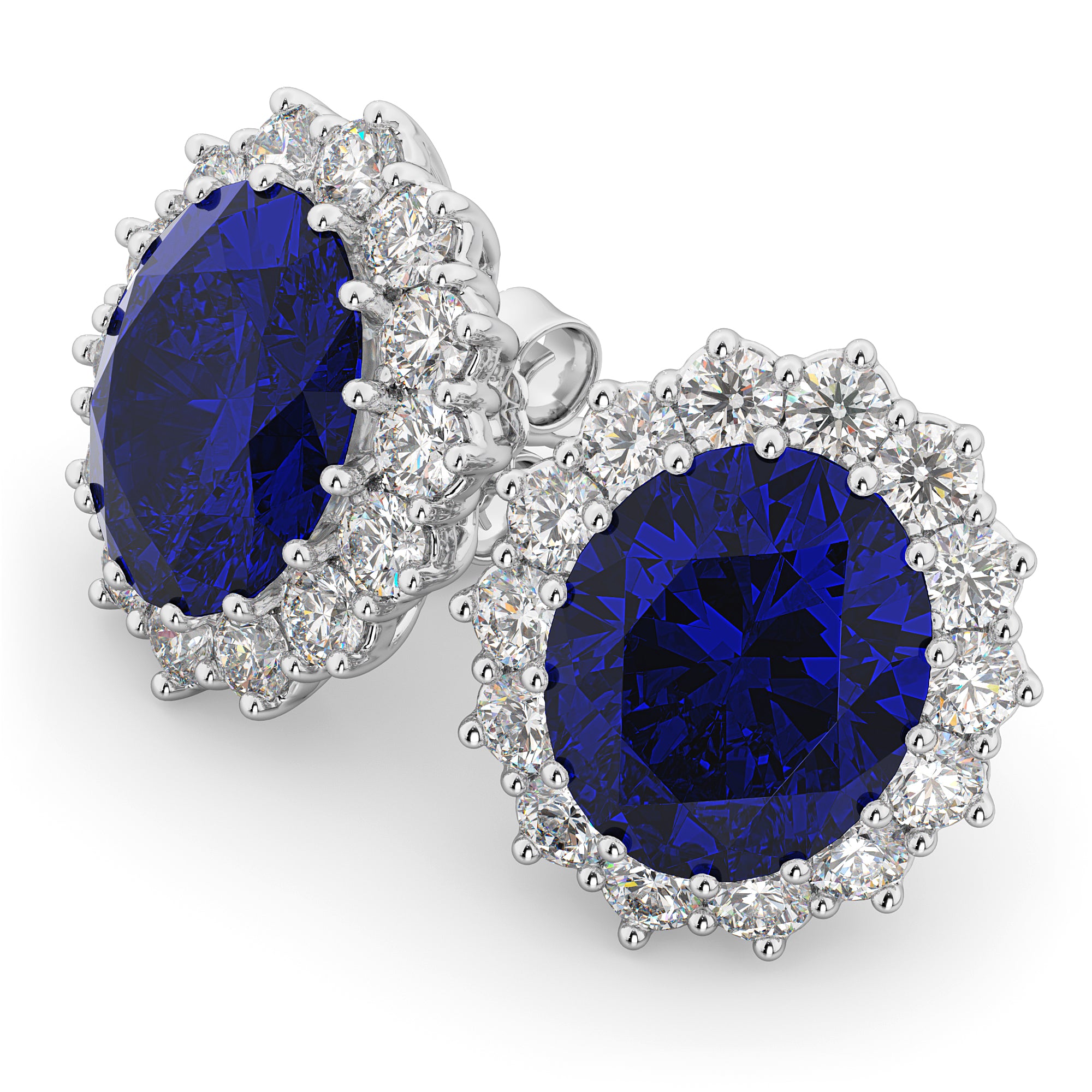 Inspired by the ring worn by Lady Diana and Princess Kate Middleton, these gorgeous precious gemstone earrings feature two 11x9mm oval shaped blue sapphire surrounded by 28 brilliant-cut round diamonds in a halo fashion.