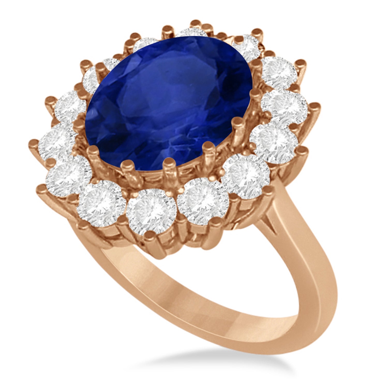 This ring is inspired by the engagement ring worn by Princess Diana and Princess Kate Middleton. The unique statement ring features a genuine and natural oval shaped 11x9mm bright blue sapphire that is complemented by 14 brilliant-cut round near-colorless diamonds of G-H Color, SI Clarity in a halo fashion. The colored gemstone and clear diamond stones rest on a 18kt rose gold band.