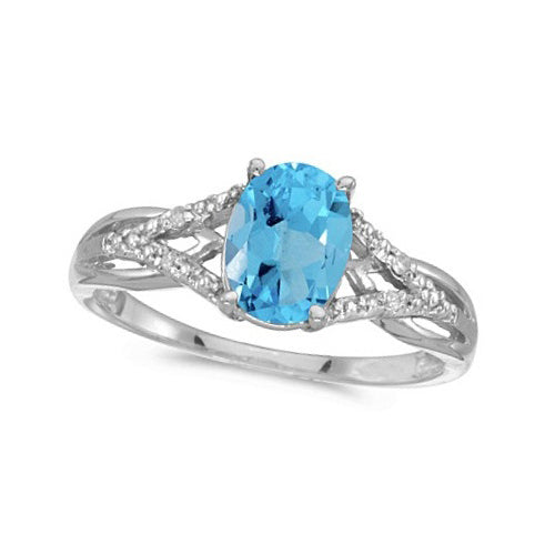 This gorgeous 14K white gold gemstone ring features an 8x6 mm genuine natural oval-shaped blue topaz set in a prong setting that is complemented by small diamonds on each side of the center stone.