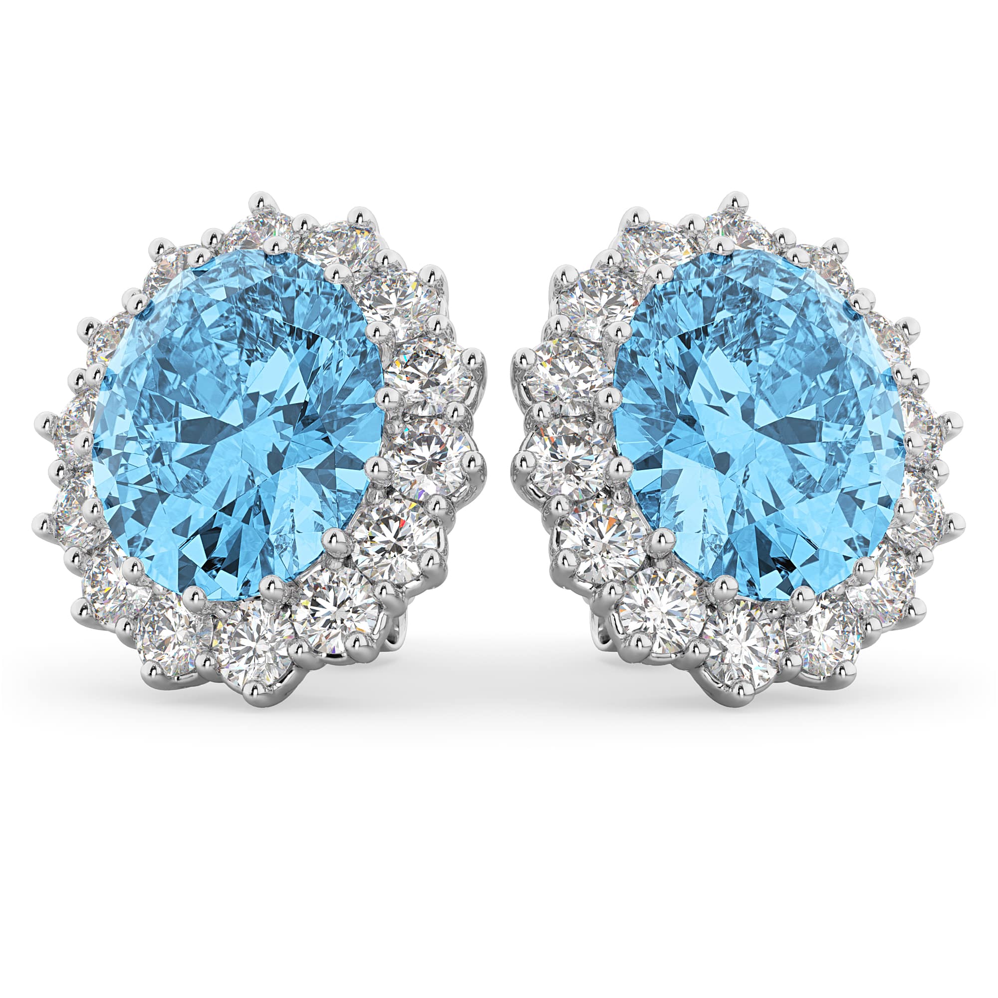 Inspired by the ring worn by Lady Diana and Princess Kate Middleton, these gorgeous precious gemstone earrings feature two 11x9mm oval shaped blue topaz surrouned by 28 brilliant-cut round diamonds in a halo fashion.