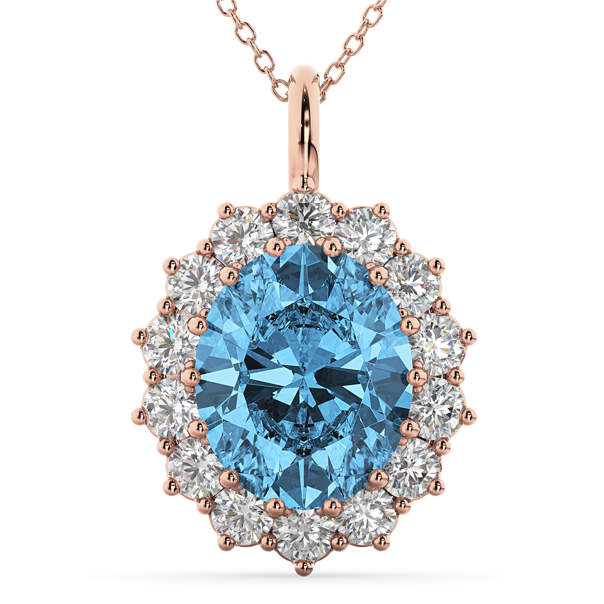 Oval Blue Topaz & Diamond Halo Pendant Necklace 14k Rose Gold (6.40ct)