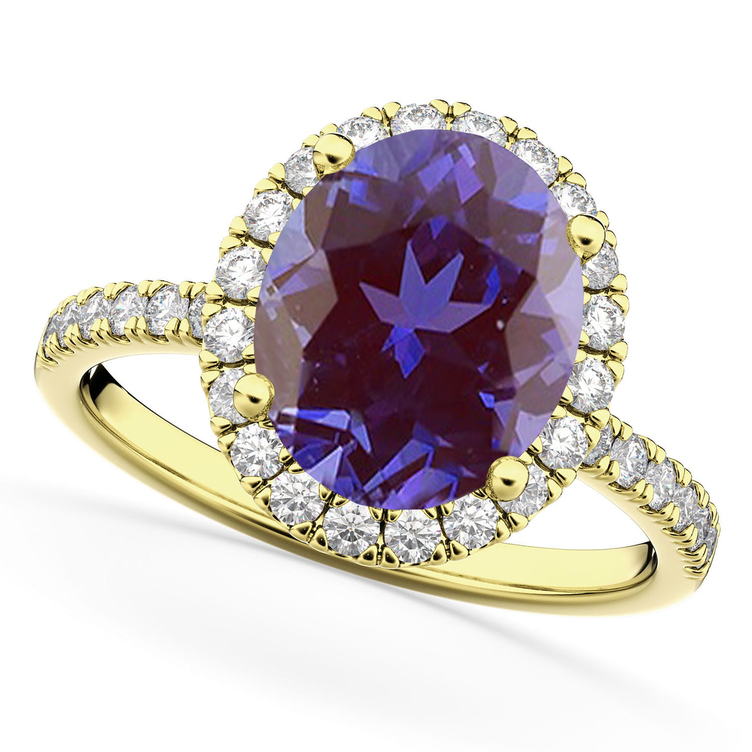 This eye-catching halo diamond ring features 0.51ct total weight of accent diamonds on the thin, 14k Yellow Gold band, as well as surrounding a 2.91ct oval cut Lab Alexandrite.