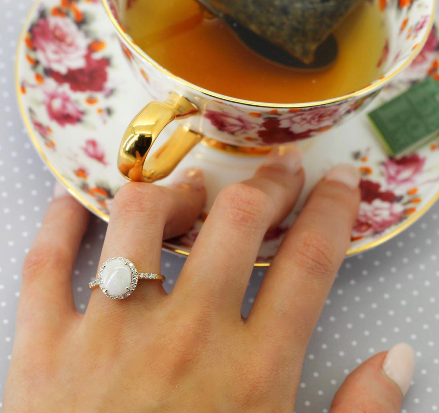 This eye-catching halo diamond ring features 0.51ct total weight of accent diamonds on the thin, 14k Rose Gold band, as well as surrounding a 1.65ct oval cut Opal.