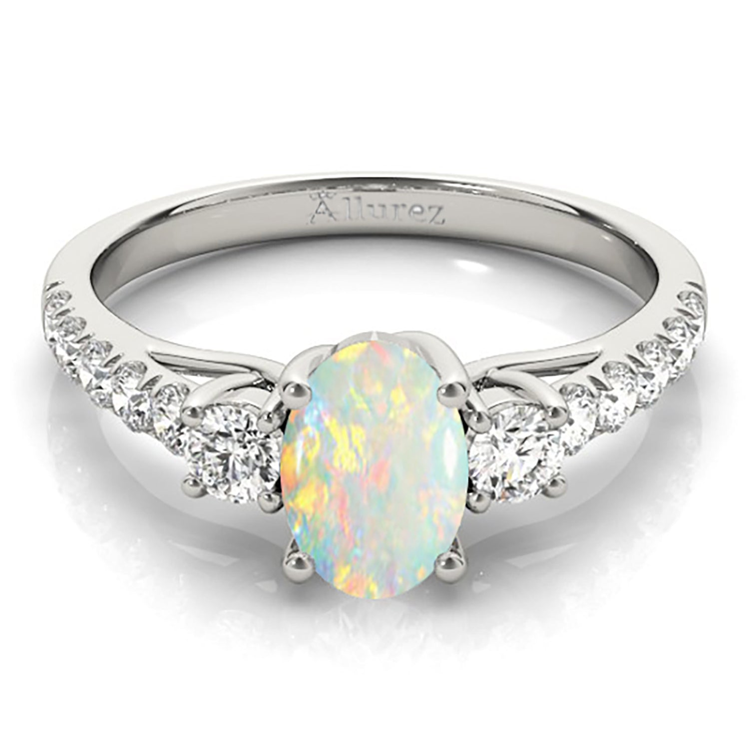 Pop the question with this elegant oval cut diamond & opal engagement ring.