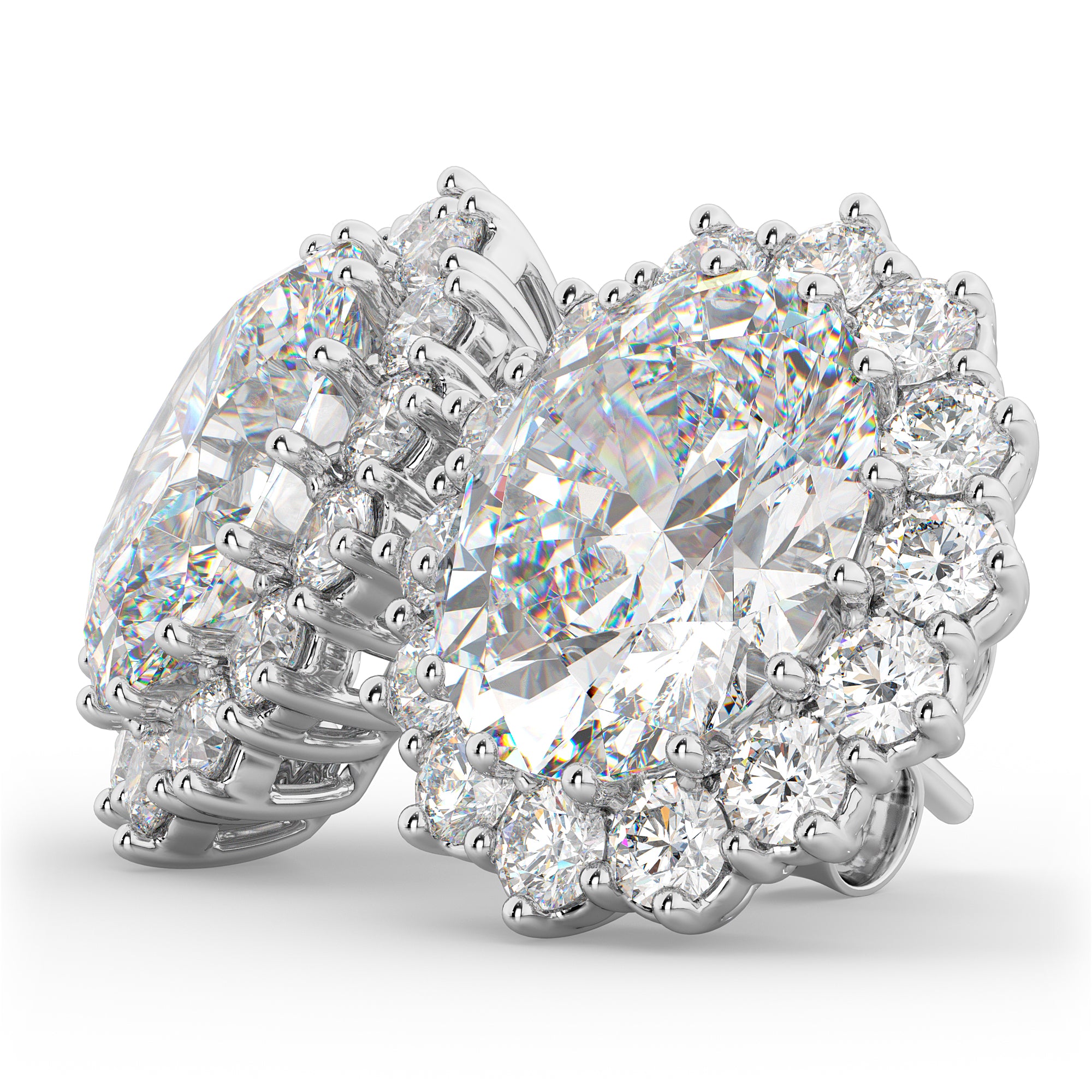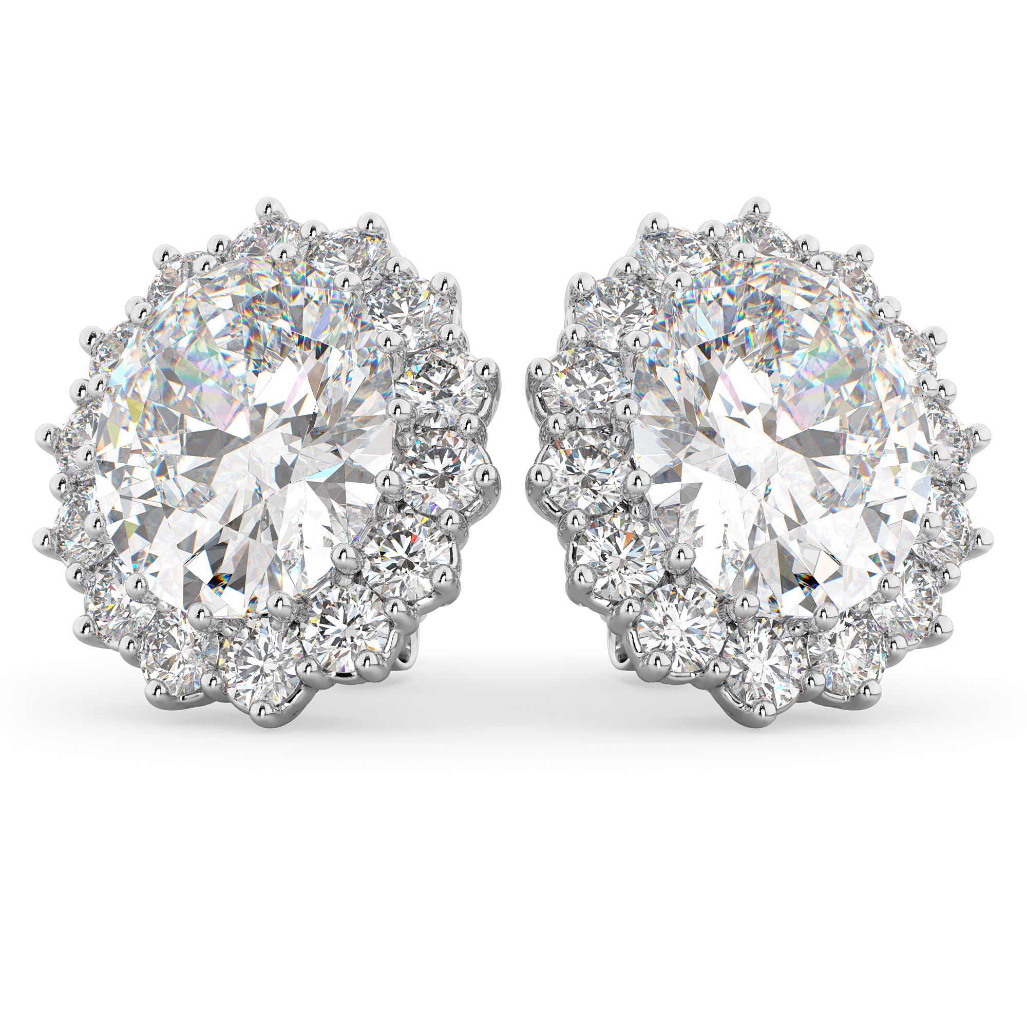 Inspired by the ring worn by Lady Diana and Princess Kate Middleton, these gorgeous precious diamond earrings feature two AAA quality 11x9mm oval shaped diamonds surrounded by 28 brilliant-cut round diamonds in a halo fashion.