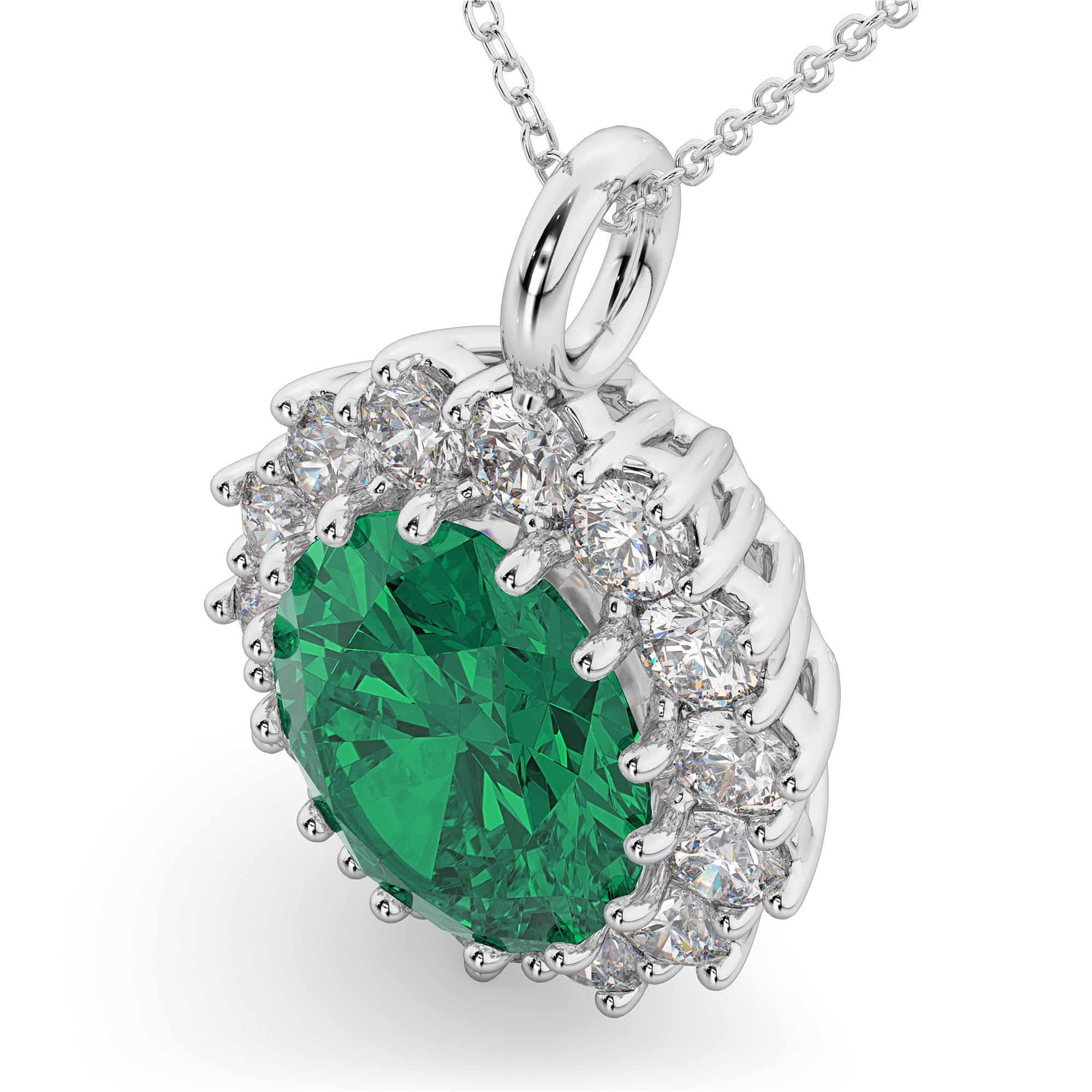 Oval Emerald & Diamond Halo Pendant Necklace 14k White Gold (6.40ct)
