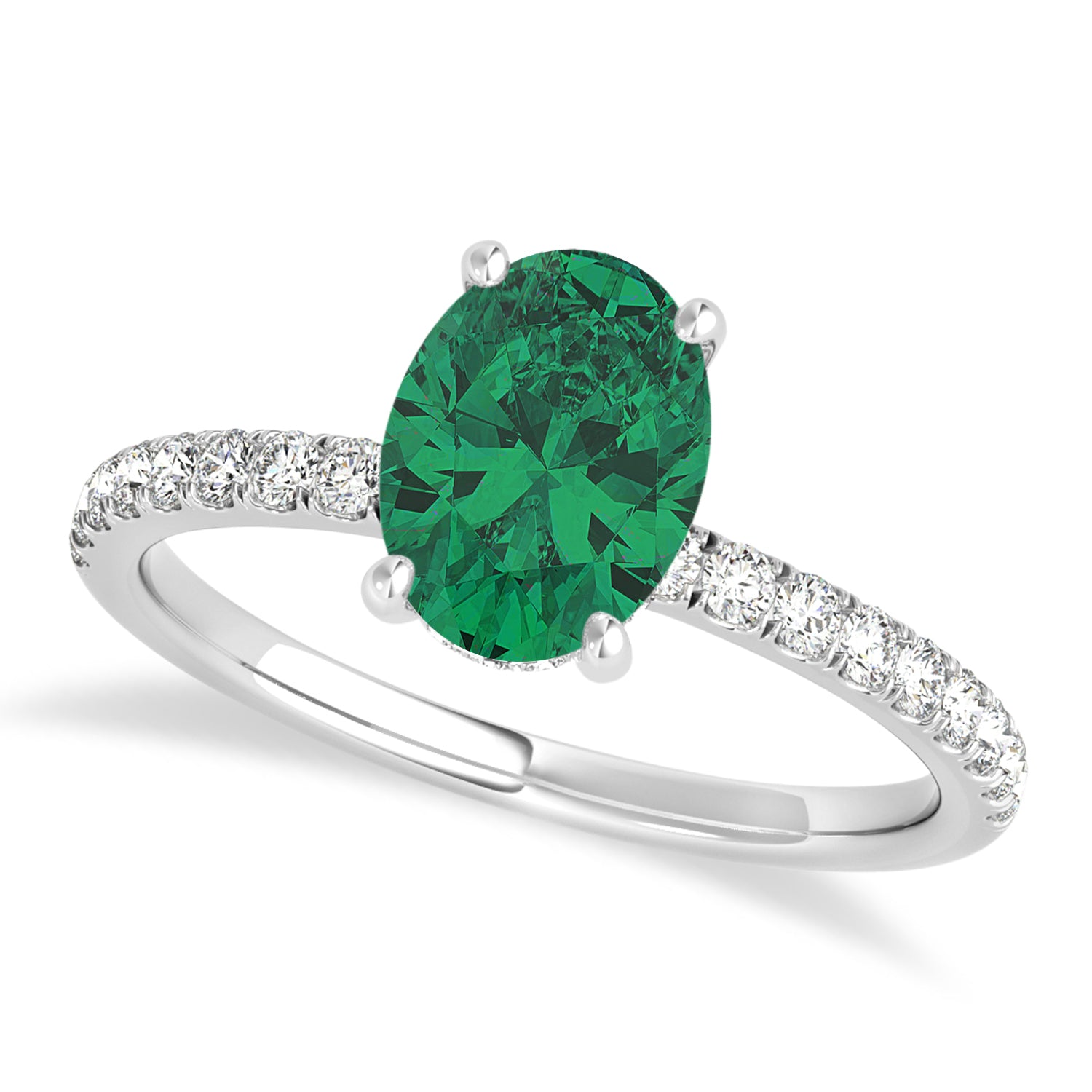 Oval Emerald & Diamond Single Row Hidden Halo Engagement Ring 14k Whit