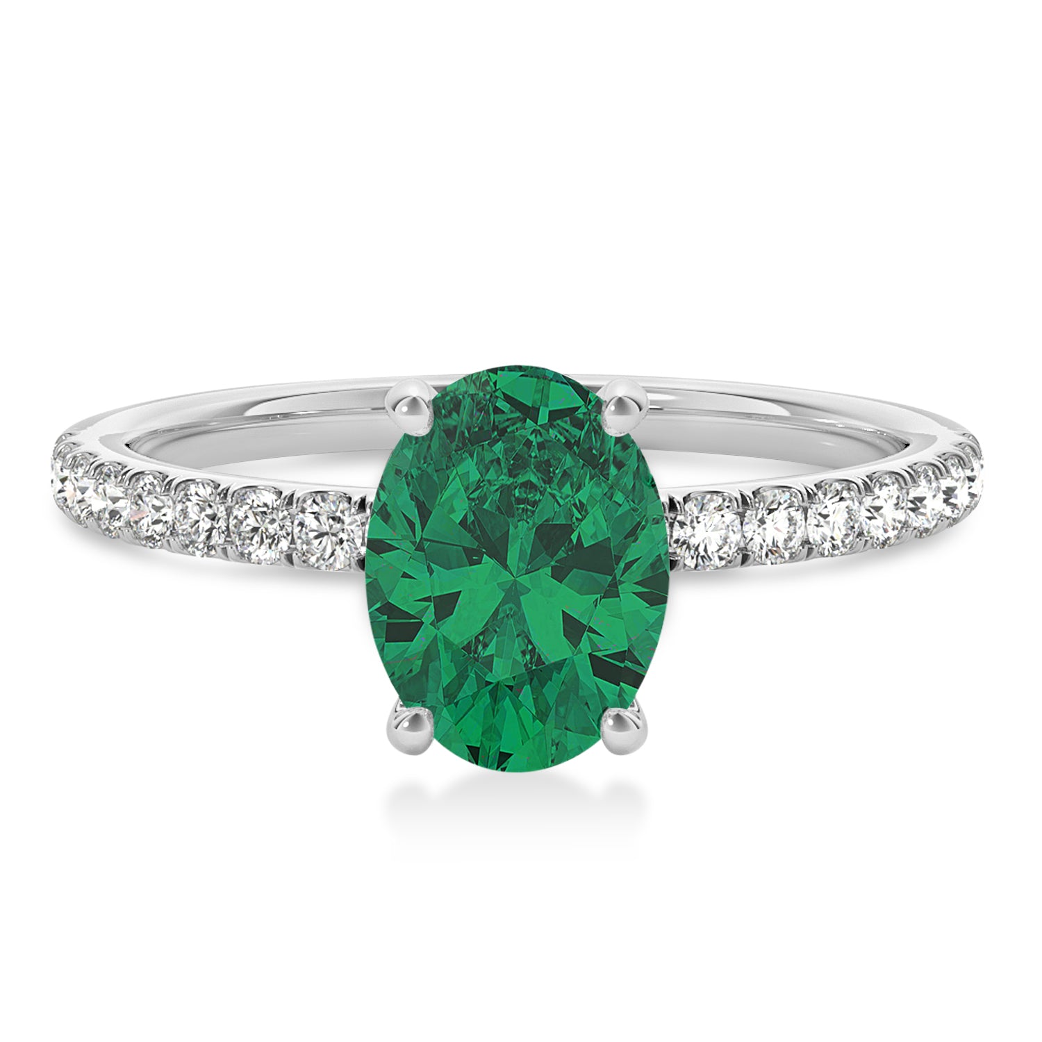 Oval Emerald & Diamond Single Row Hidden Halo Engagement Ring 14k White Gold (0.68ct)