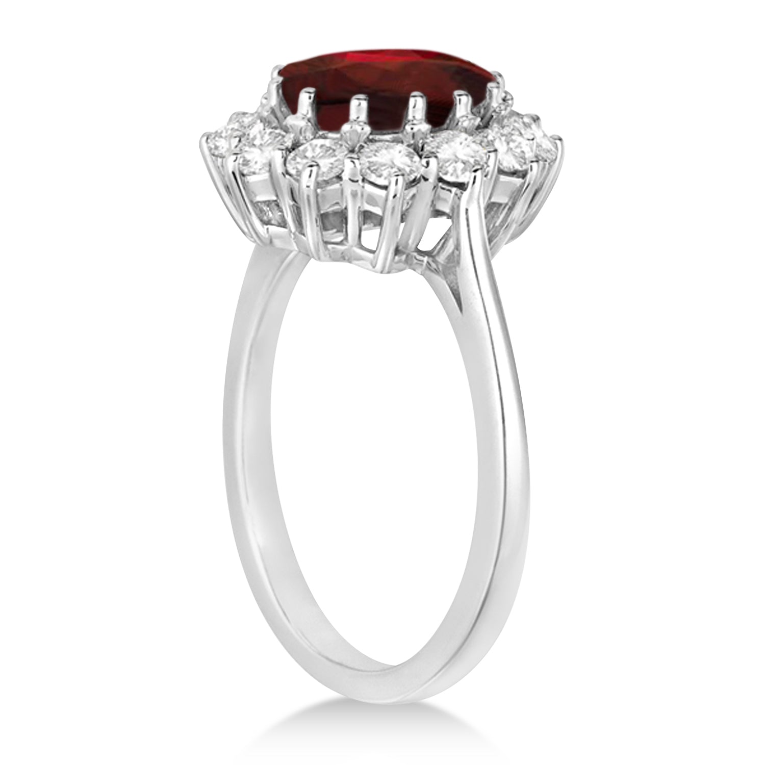 This ring is inspired by the engagement ring worn by Princess Diana and Princess Kate Middleton. The unique garnet ring with diamonds features a genuine and natural oval shaped 9x7mm red garnet that is complemented by 12 brilliant-cut round near-colorless diamonds of G-H Color, SI Clarity in a halo fashion. The colored gemstones and clear diamond stones rest on a 18kt white gold band.