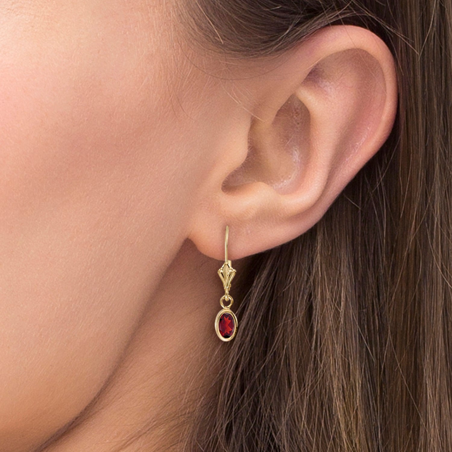 In each 14K yellow gold earring, an oval-shaped garnet is set in a sparkling bezel setting beautifully suspended from a leverback.