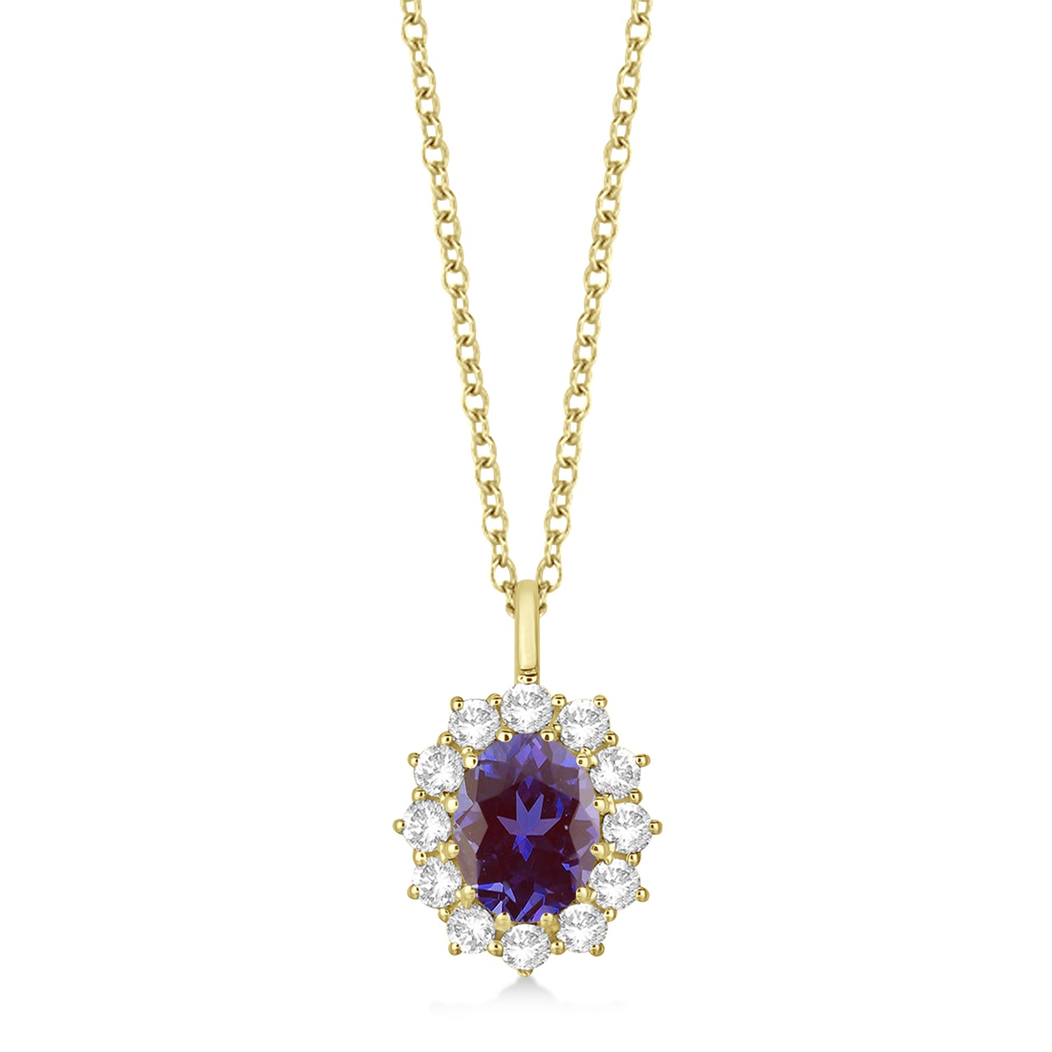 Inspired by jewelry worn by Lady Diana and Princess Kate Middleton, this gorgeous precious gemstone pendant necklace features an oval shaped 9x7mm lab alexandrite accented by 12 brilliant-cut round diamonds in a halo fashion.