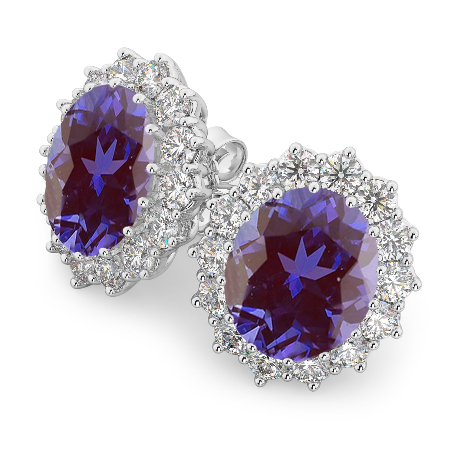 Inspired by the ring worn by Lady Diana and Princess Kate Middleton, these gorgeous precious gemstone earrings feature two AAA quality 11x9mm oval shaped lab grown alexandrites surrouned by 28 brilliant-cut lab grown round diamonds in a halo fashion.