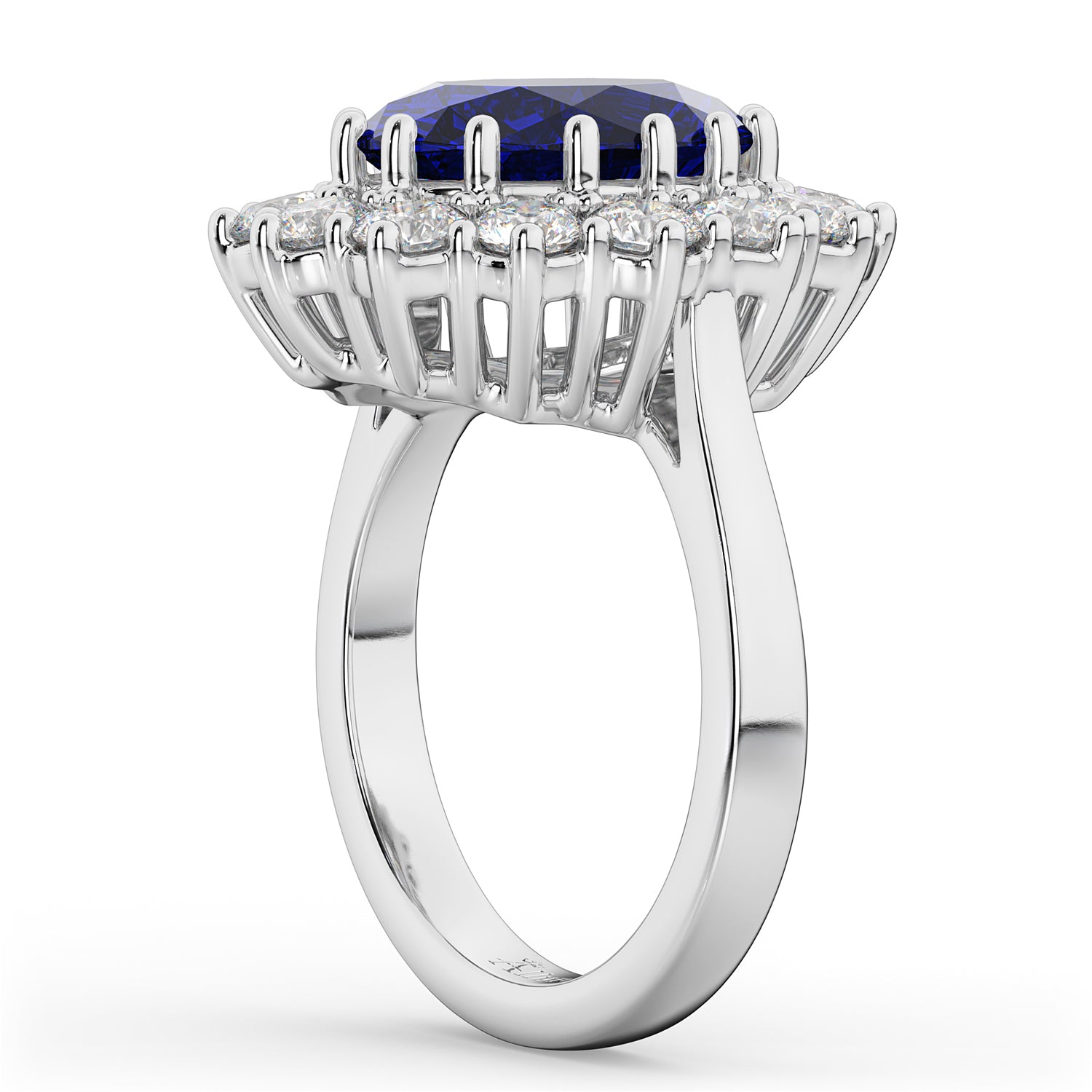 Oval Lab Blue Sapphire & Diamond Halo Lady Di Ring 14k White Gold (6.40ct)