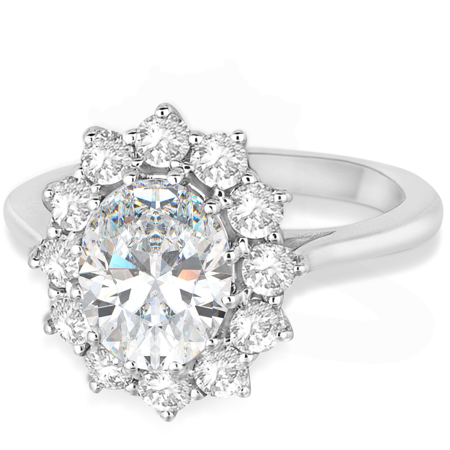 This ring is inspired by the engagement ring worn by Princess Diana and Princess Kate Middleton. The unique statement ring features a genuine and natural oval shaped 9x7mm Lab diamond that is complemented by 12 brilliant-cut round near-colorless diamonds of G Color, VS1 Clarity in a halo fashion. The clear diamond stones rest on a 14kt white gold band.