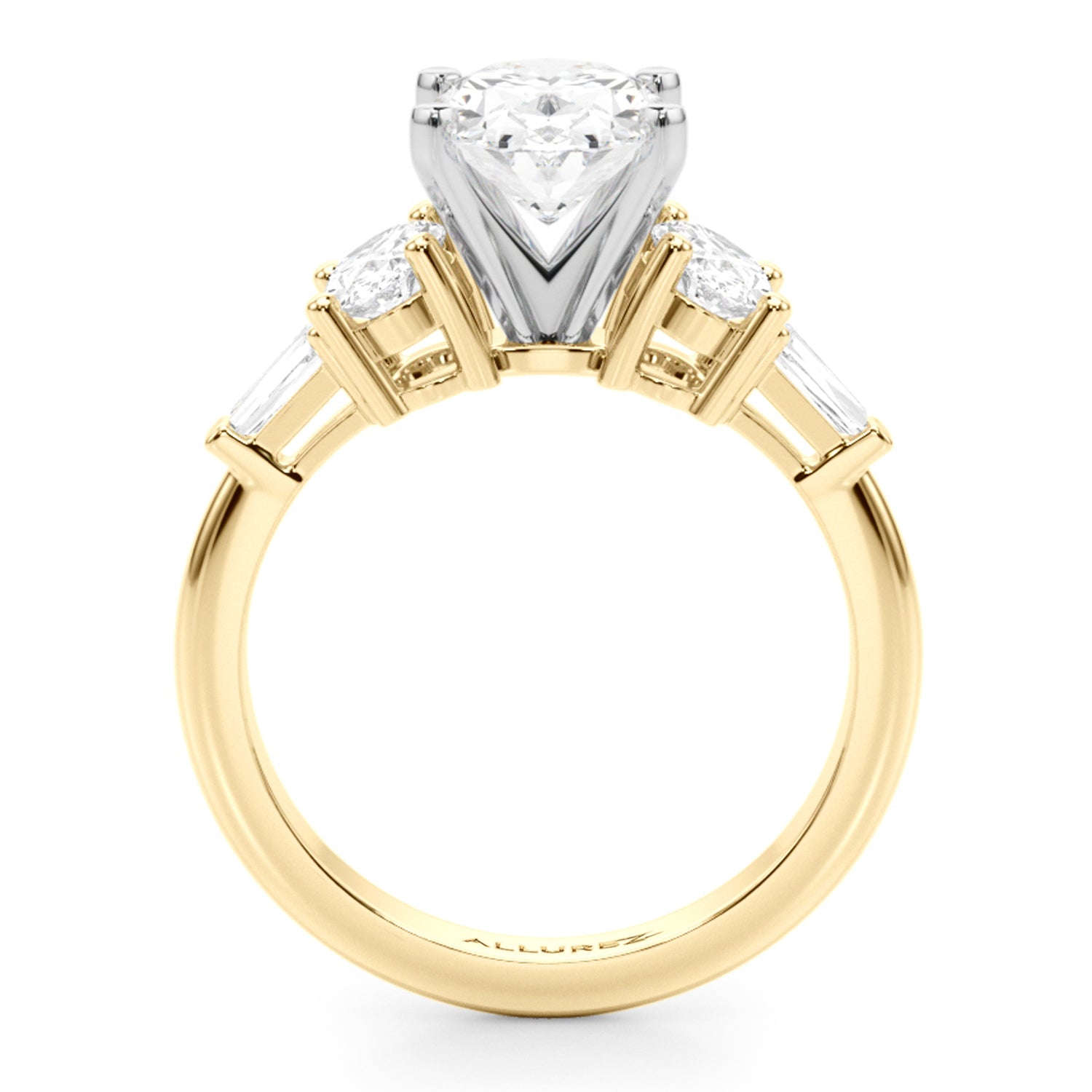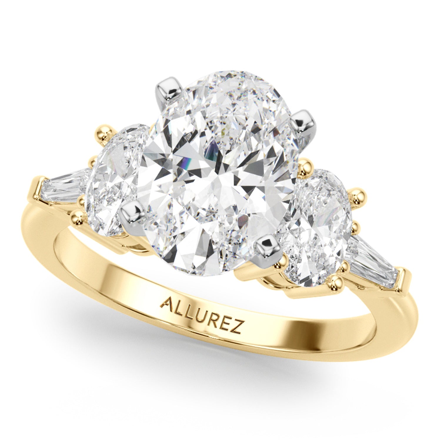 The centerpiece is a breathtaking 3-carat Oval lab grown diamond, surrounded by two oval 0.50-carat side stones (5.8x4.1mm) and two taper baguette 0.09-carat accent stones (4.02x1.5mm). And the exquisite Wedding Band piece showcases a stunning combination of a Straight Baguette (5x2.5), two radiant Oval stones (4x3), and two delicate Taper Baguettes (4x2x1.5)