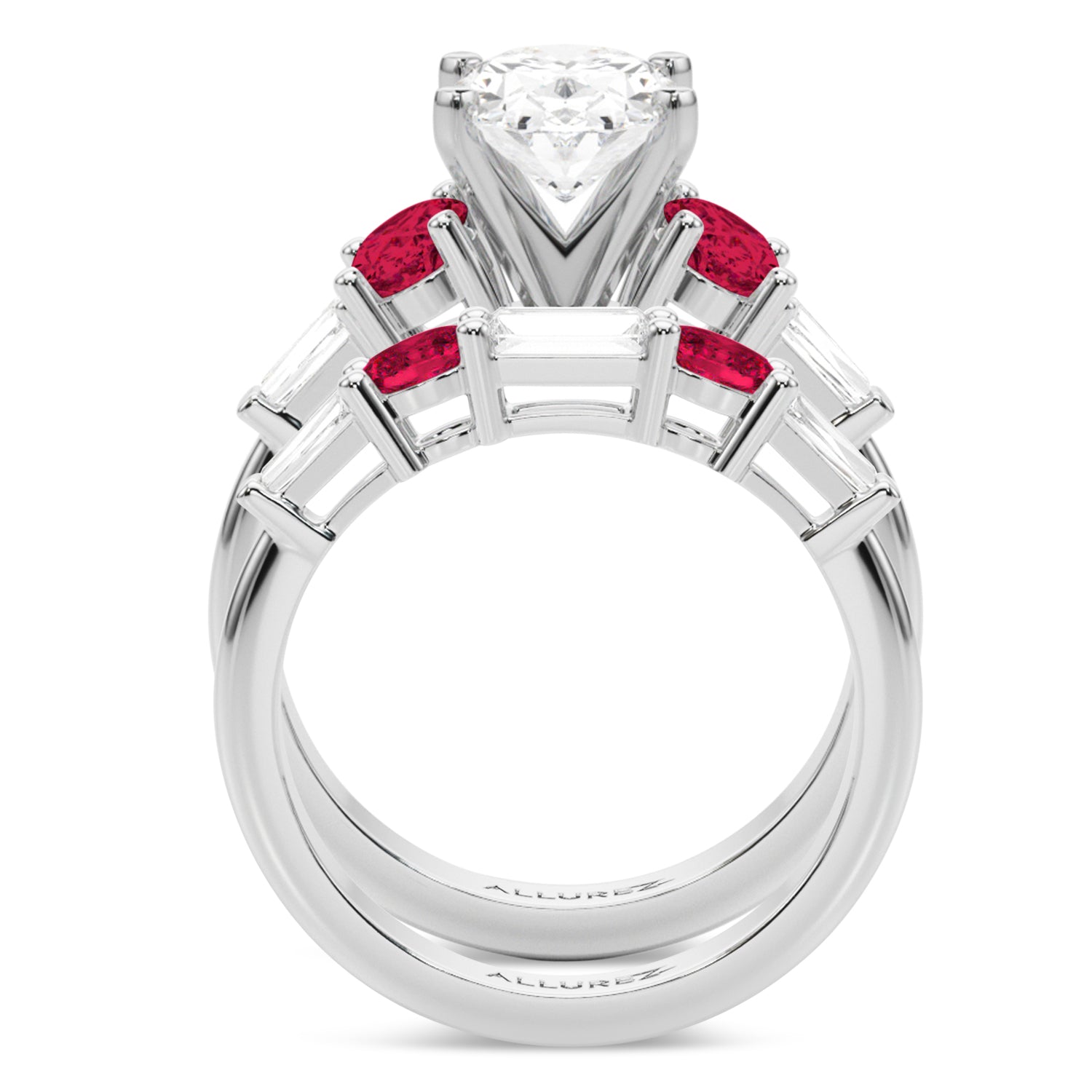 Discover the elegance of the Oval Lab Grown Diamond & Oval Ruby Bridal Set, meticulously crafted in 14K White Gold, showcasing a stunning 5.09-carat brilliance. The centerpiece is a breathtaking 3-carat Oval diamond, surrounded by two oval 0.53-carat Ruby side stones (5.8x4.1mm) and two taper baguette 0.09-carat accent stones (4.02x1.5mm). The exquisite wedding band showcases a stunning combination of lab grown diamonds, including a Straight Baguette (5x2.5), two delicate Taper Baguettes (4x2x1.5) and two radiant Oval Ruby stones (4x3).