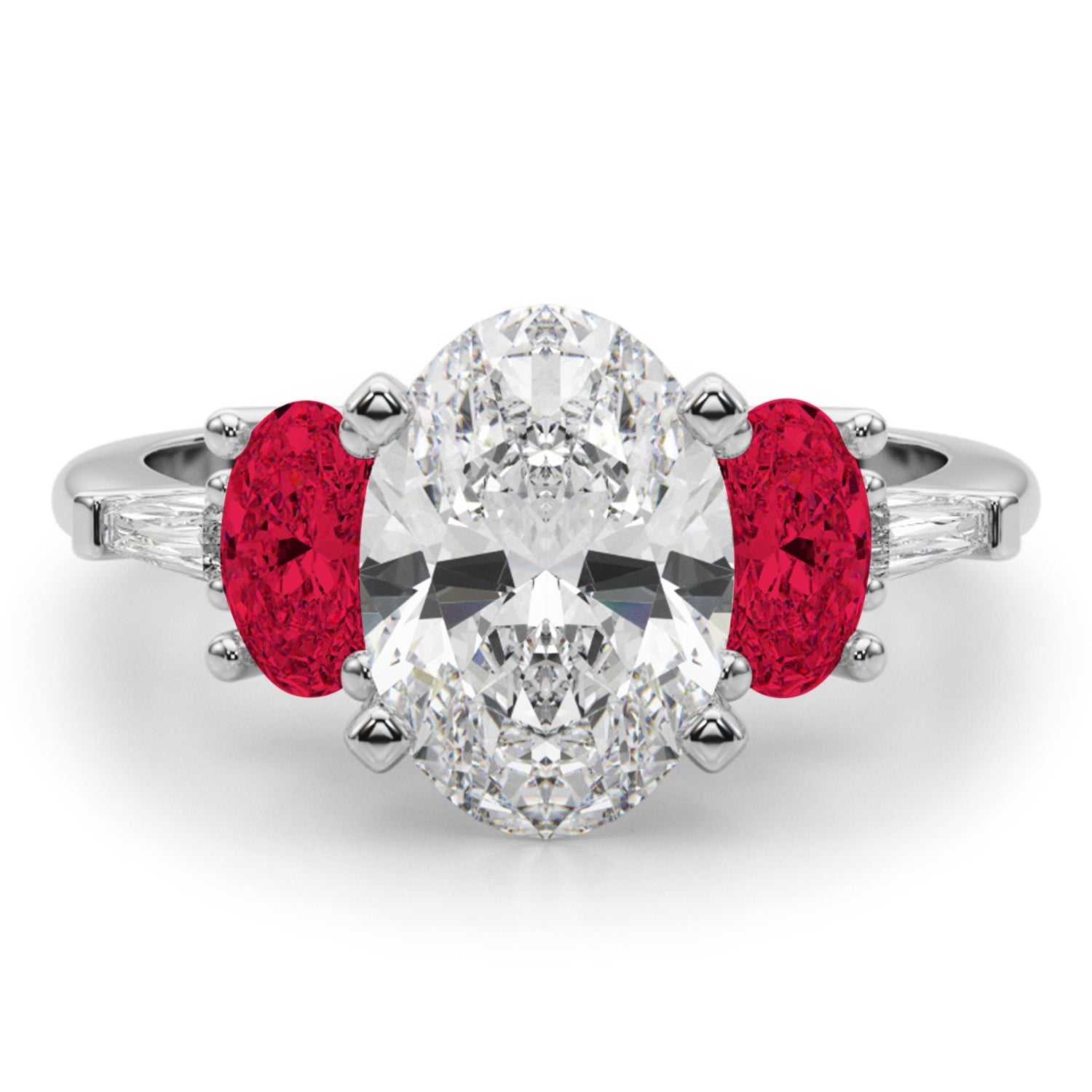 Discover the elegance of the Oval Lab Grown Diamond & Oval Ruby Engagement Ring, meticulously crafted in 14K White Gold, showcasing a stunning 4.24-carat brilliance. The centerpiece is a breathtaking 3-carat Oval diamond, surrounded by two oval 0.53-carat Ruby side stones (5.8x4.1mm) and two taper baguette 0.09-carat accent stones (4.02x1.5mm).