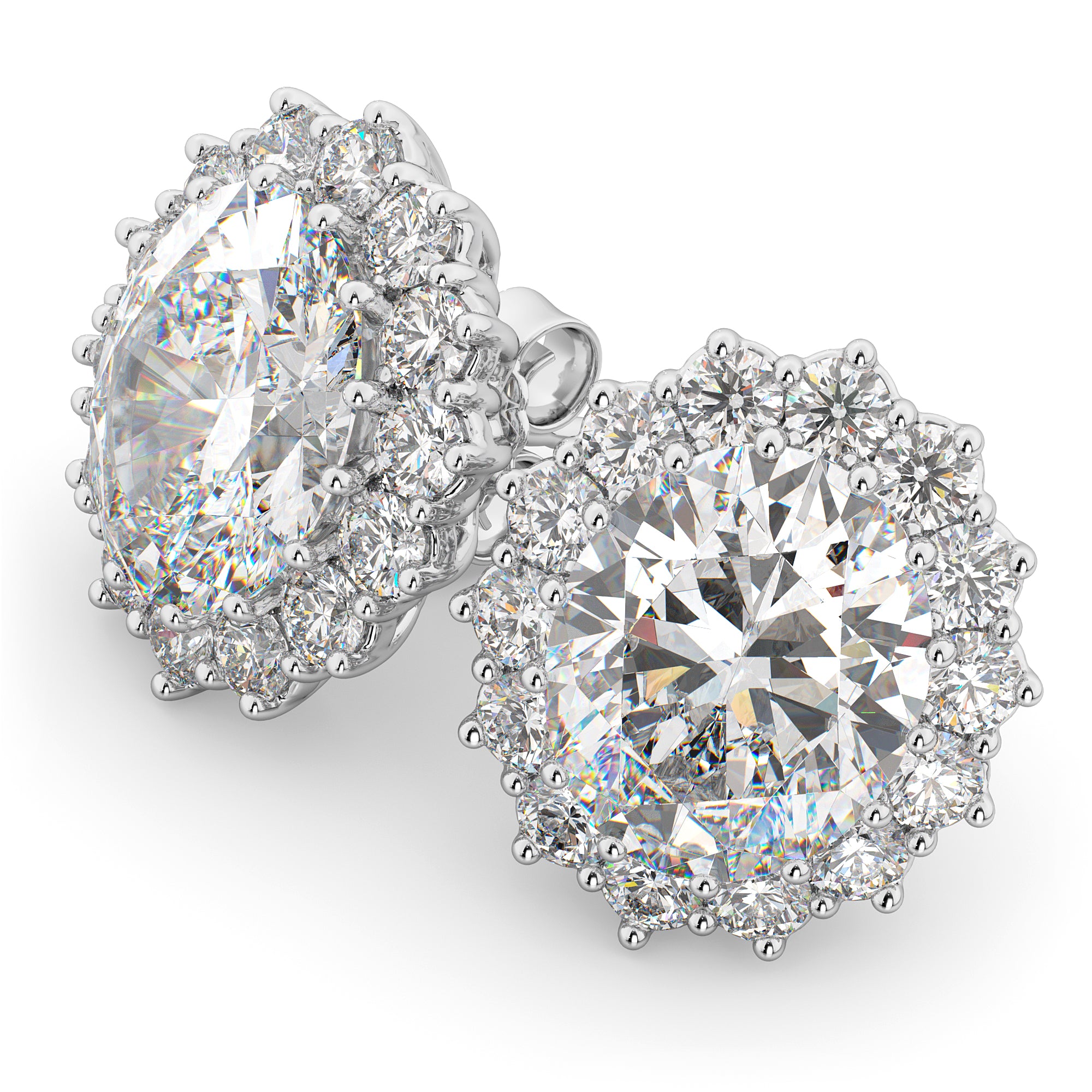 Inspired by the ring worn by Lady Diana and Princess Kate Middleton, these gorgeous precious moissanite earrings feature two AAA quality 11x9mm oval shaped moissanites surrounded by 28 brilliant-cut round diamonds in a halo fashion.