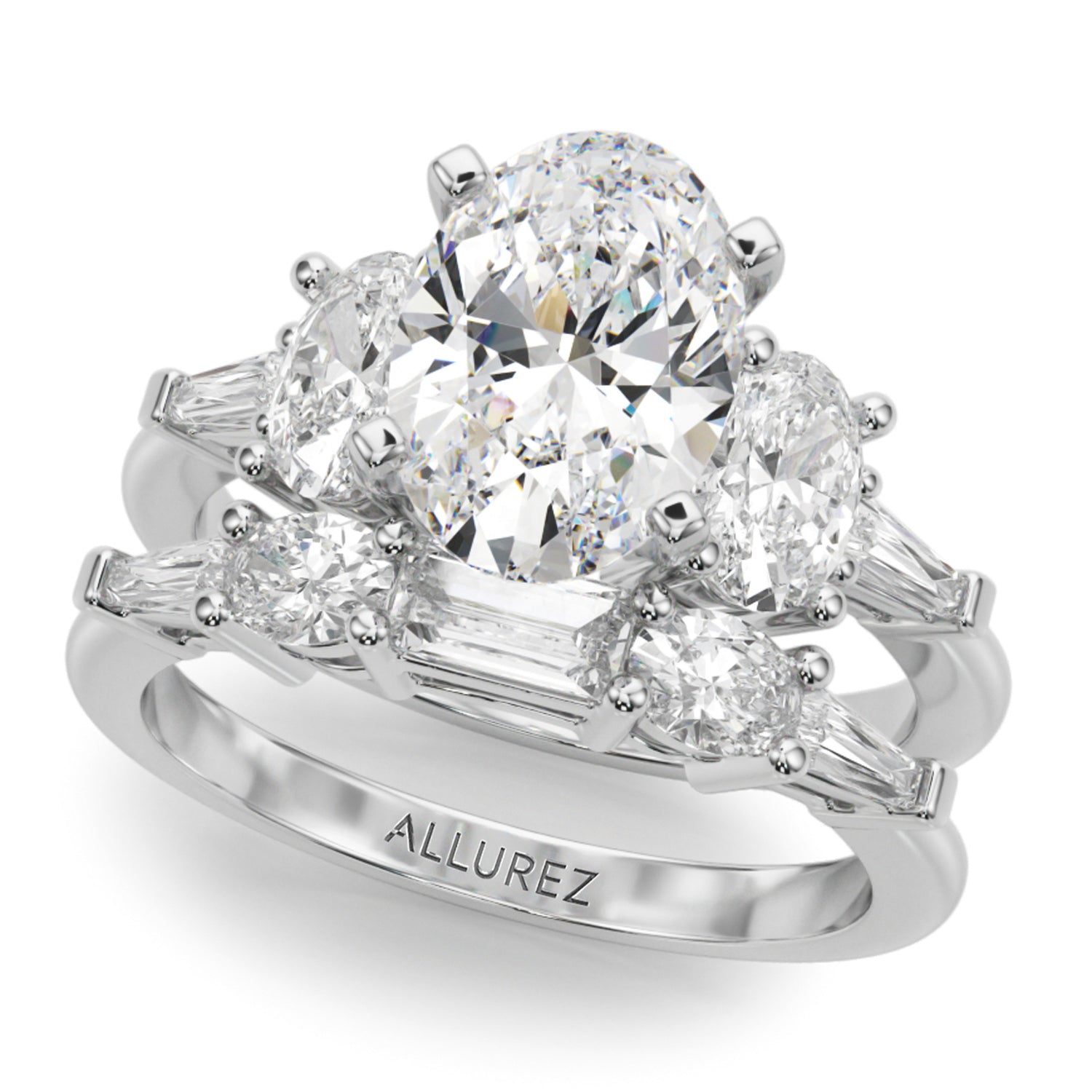 The centerpiece is a breathtaking 3-carat Oval Moissanite diamond, measuring 9.4mm, surrounded by two oval 0.50-carat lab grown diamond side stones (5.8x4.1mm) and two taper baguette 0.09-carat lab grown diamond accent stones (4.02x1.5mm). And the exquisite Wedding Band piece showcases a stunning combination of a Straight Baguette (5x2.5), two radiant Oval stones (4x3), and two delicate Taper Baguettes (4x2x1.5)
