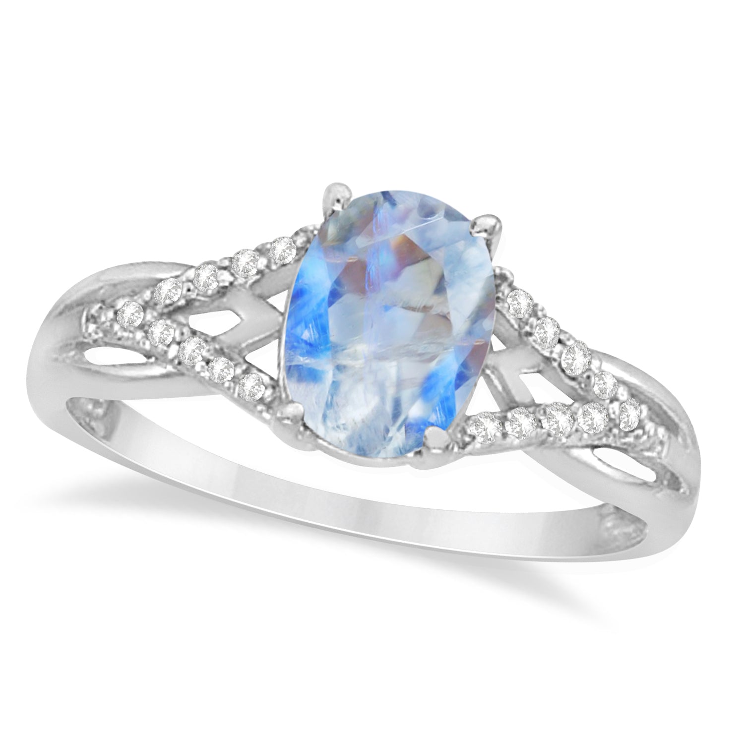 This gorgeous 14K white gold gemstone ring features an 8x6 mm genuine natural oval-shaped Moonstone set in a prong setting that is complemented by small diamonds on each side of the center stone.