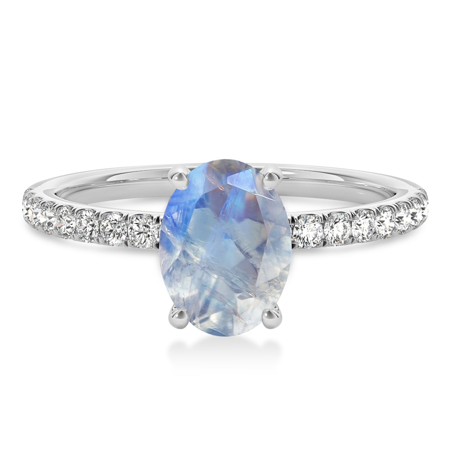 A 0.43 carat oval-shaped Moonstone is prong set into 18k White Gold in this preset...