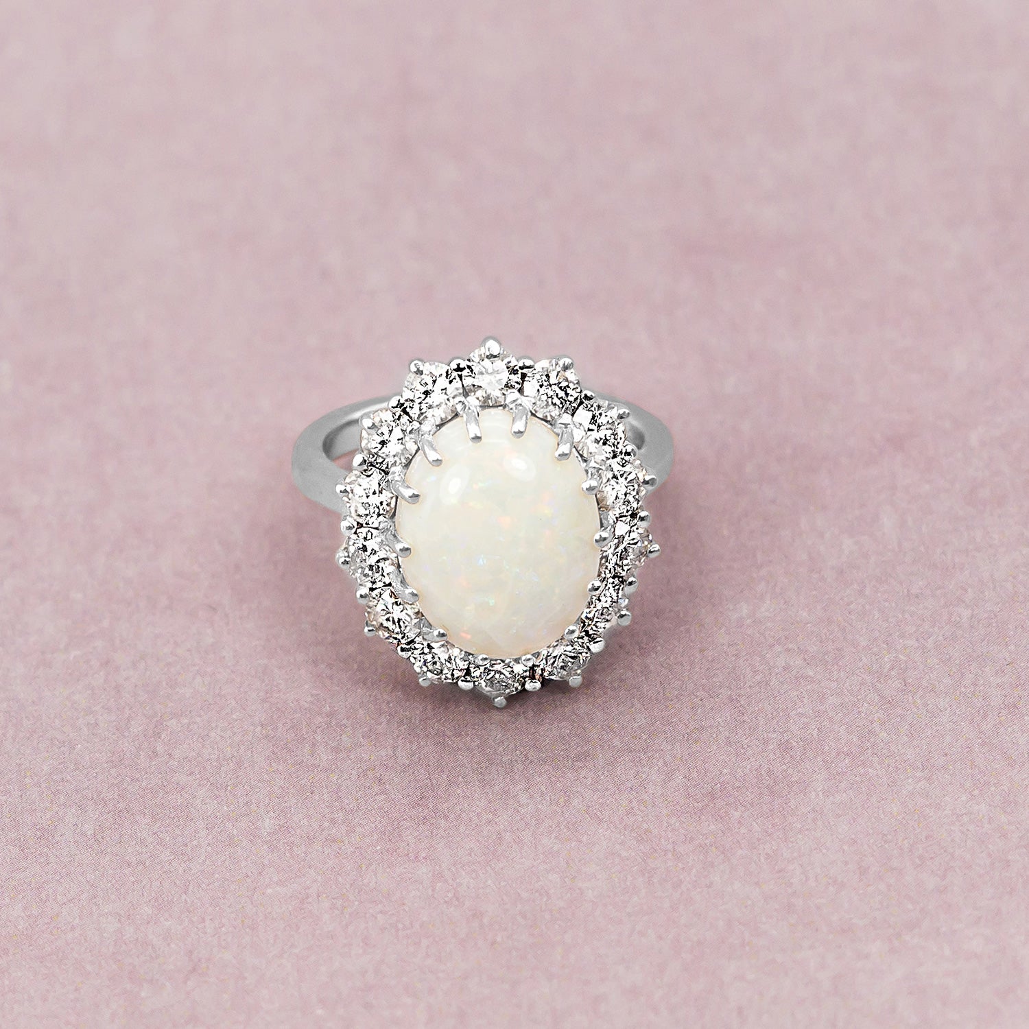 This prestigous diamond accented opal ring is inspired by the engagement ring worn by Princess Diana and Princess Kate Middleton. This unique and luxurious ring makes a statement with its 12x10mm genuine and natural oval shaped White opal that is complemented by 14 brilliant-cut round near-colorless diamonds of G-H Color, SI Clarity in an oval halo fashion. The white colored gemstone and clear diamond stones rest on a remarkably stunning 14kt white gold band.