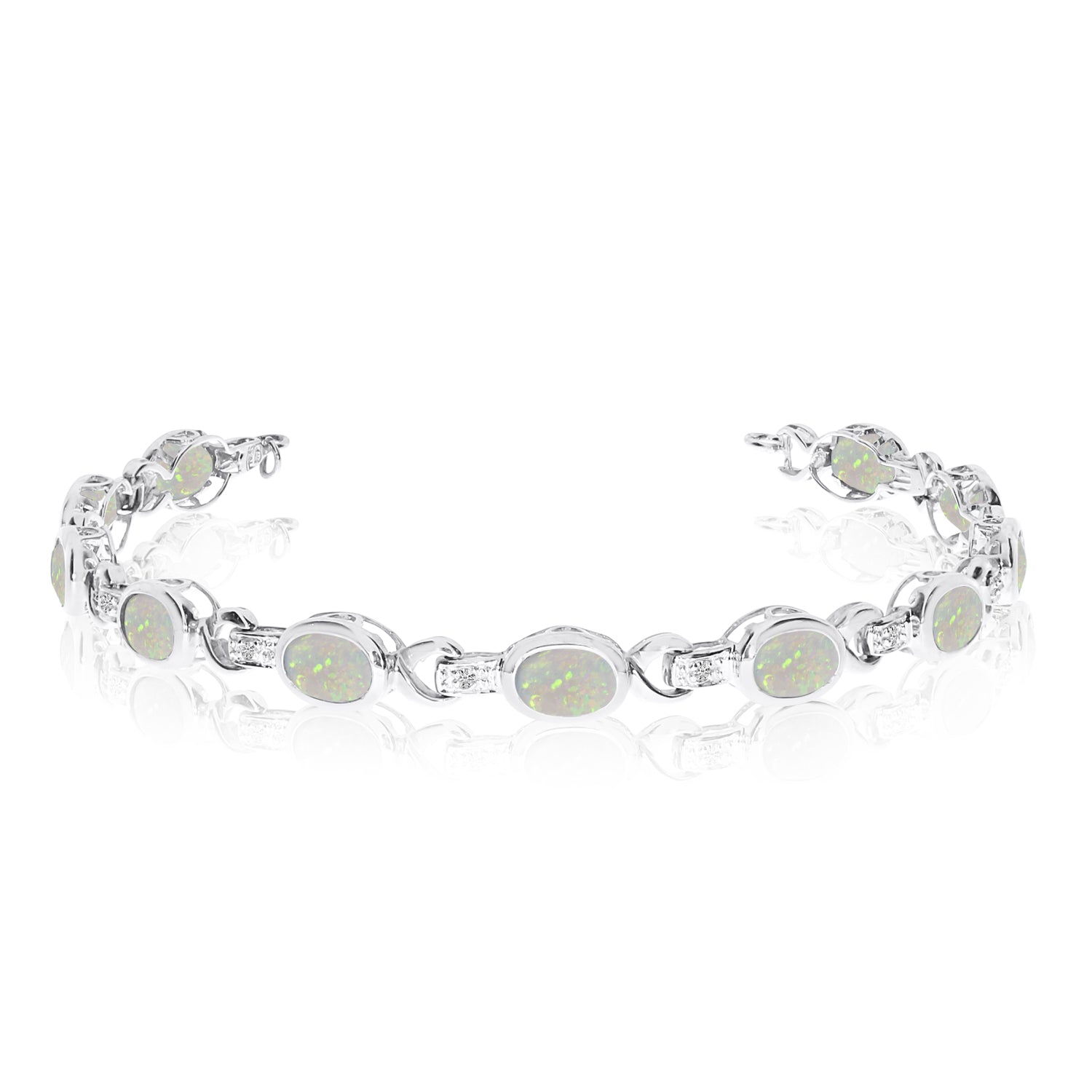 This unique designer link bracelet showcases eleven 7x5mm White Opals accented by 11 brilliant cut round near-colorless diamonds of G-H Color and SI Clarity. The genuine and natural colored gemstones and shiny diamonds are set in a classic 14kt White Gold bezel setting.
