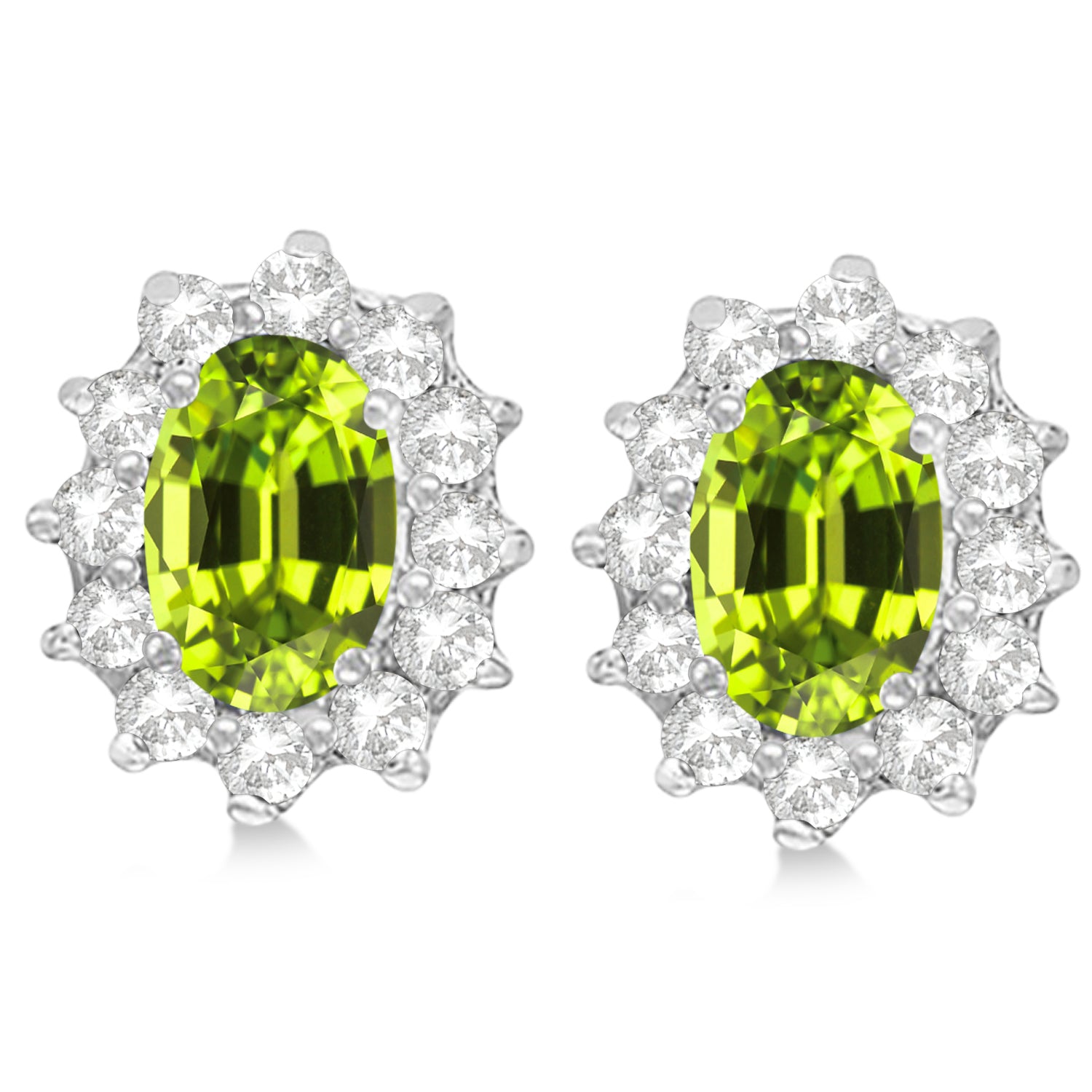 The earrings feature two oval shaped 6x4mm peridot stones that weigh a total of 1.80 carats. Each peridot center stone is surrounded by a halo of 12 round nearly colorless diamond stones, prong set, (24 total) that weigh a total of 0.25 carats.