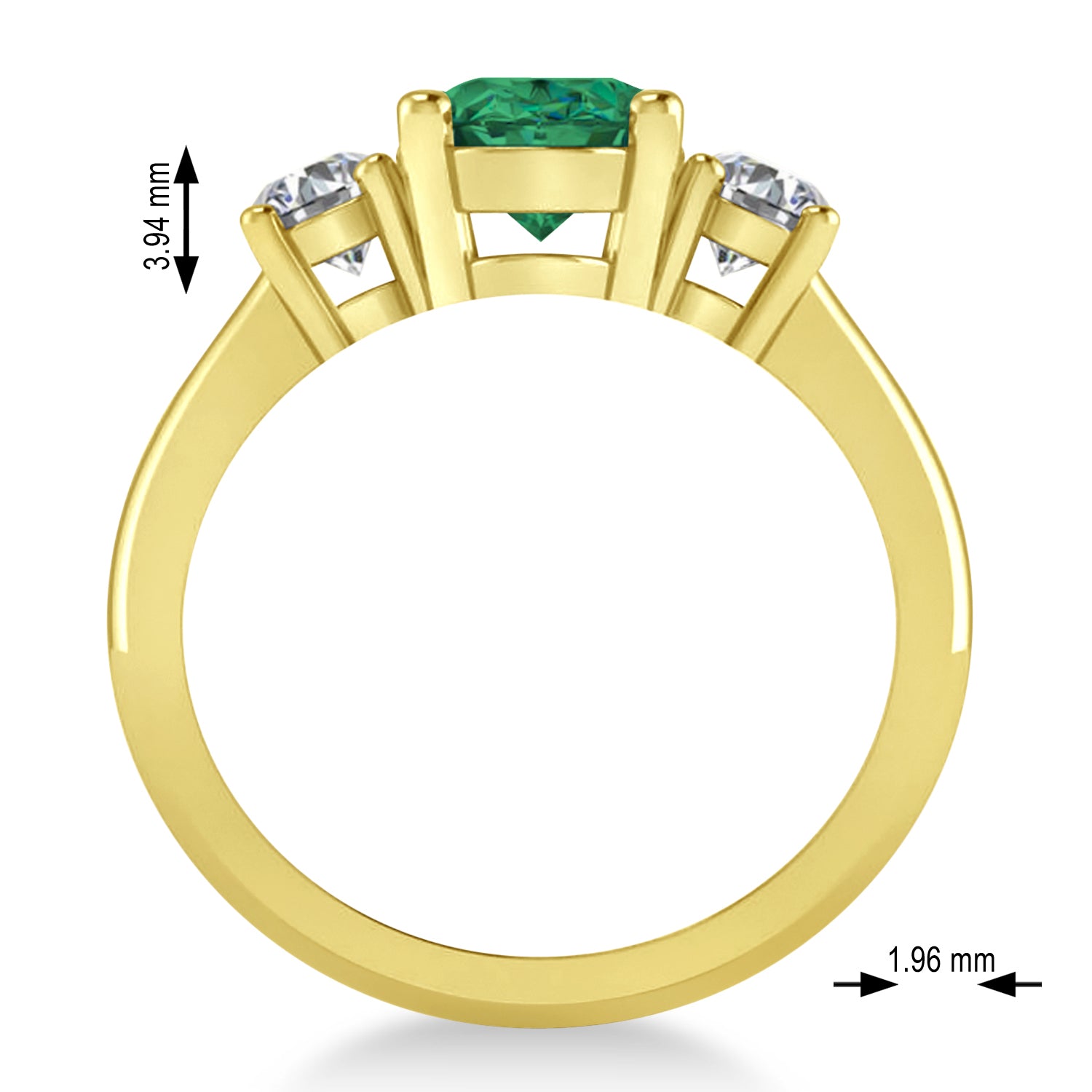 All stones are prong set with a combined 3.0 total carat weight. Diamonds are rated G-H for color and SI1-SI2 for clarity; the emerald is rated eye-clean for clarity
