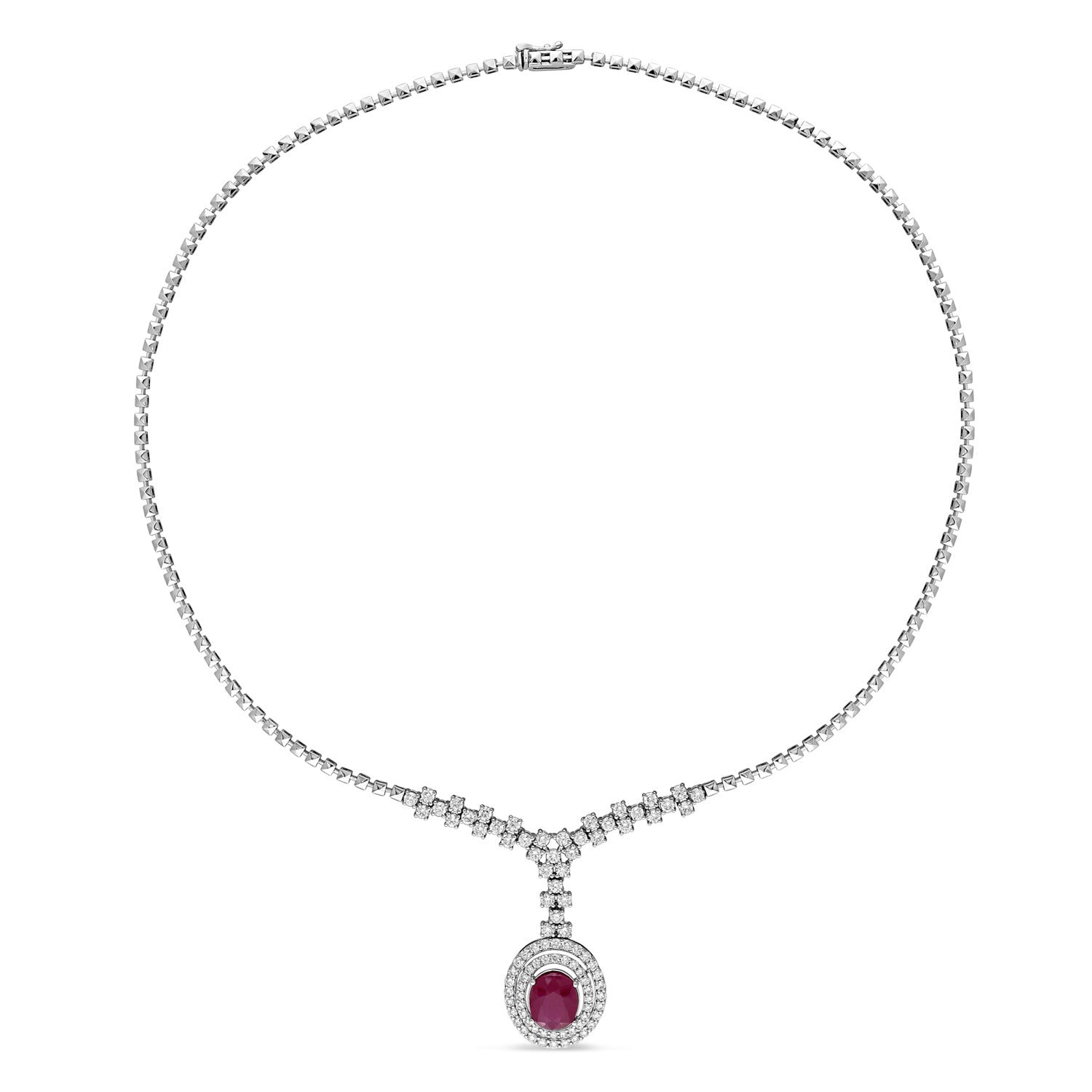 Oval Ruby & Round Diamond Pendant Necklace 14k White Gold (6.50 ct )