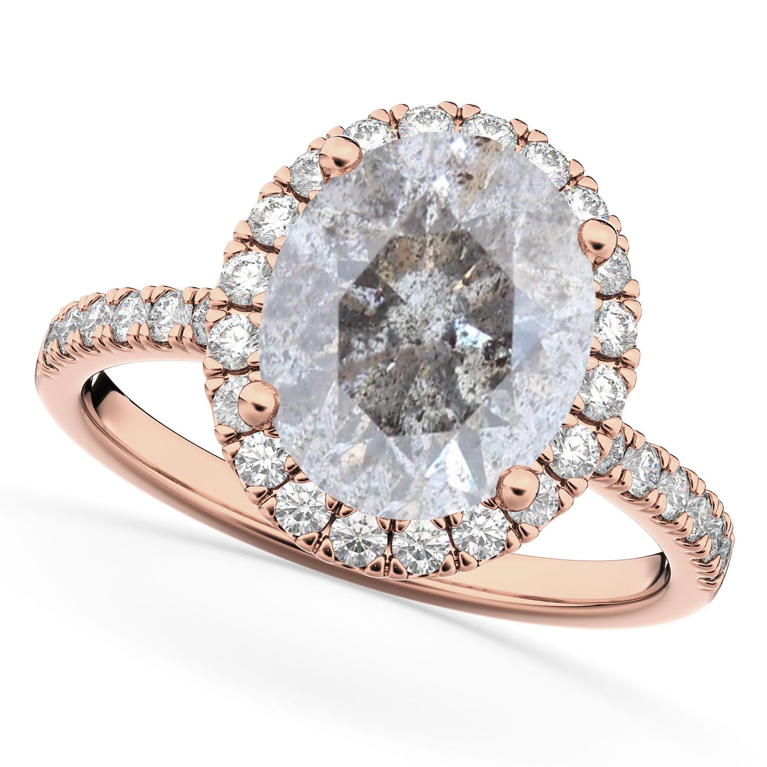 This eye-catching halo diamond ring features 0.51ct total weight of accent diamonds on the thin, 14k Rose Gold band, as well as surrounding a 3.00ct oval cut Salt & Pepper diamond.