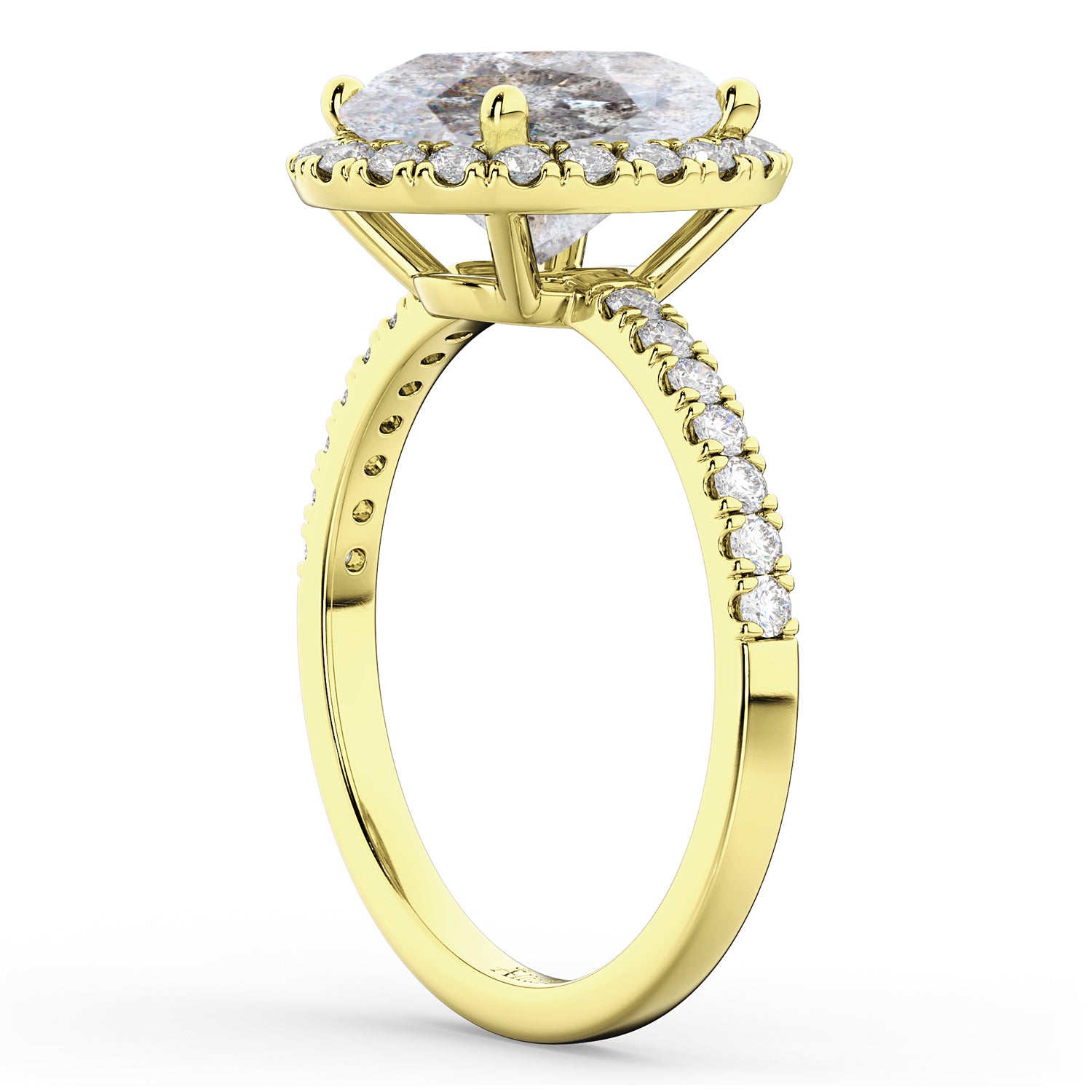 This eye-catching halo diamond ring features 0.51ct total weight of accent diamonds on the thin, 14k Yellow Gold band, as well as surrounding a 3.00ct oval cut Salt & Pepper diamond.