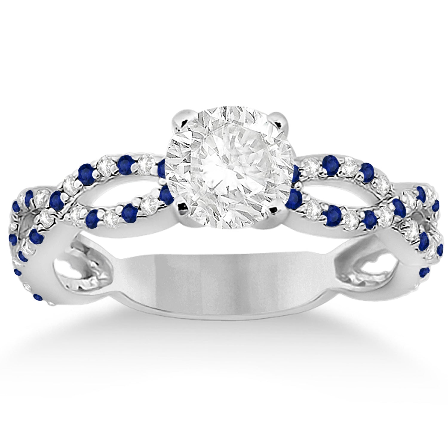Let her know how much she means to you with this twisted infinity micro pave diamond & blue sapphire engagement ring. 76 round diamonds circling almost all the way around (except a small bar for resizing) are accented on a twisted 14k white gold setting.
