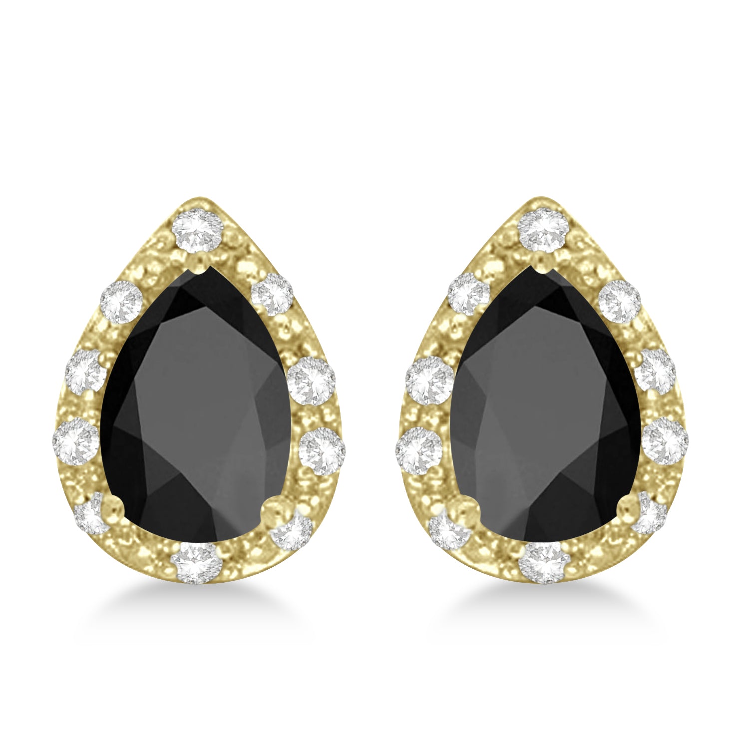 In each 14K yellow gold earring a genuine genuine 7x5mm Pear shaped shaped Black Onyx is accented by bright diamonds in a halo fashion, making these unique 14kt yellow gold gemstone studs unlike any other.