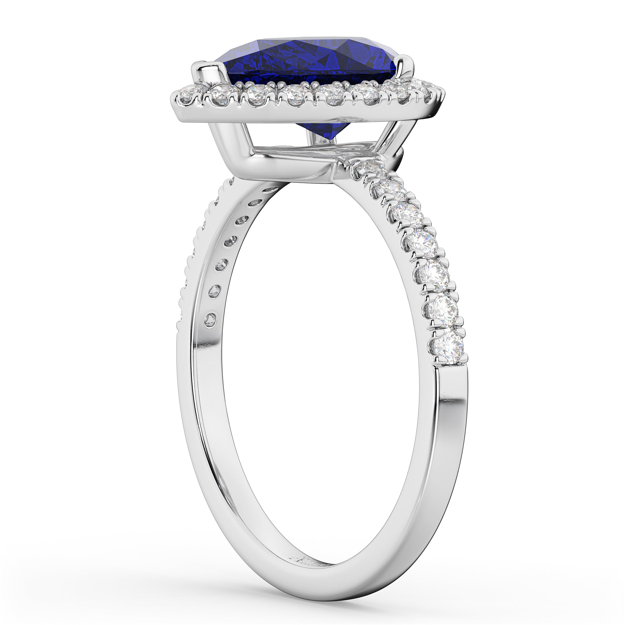 Pear Cut Halo Lab Blue Sapphire & Lab Diamond Engagement Ring 14K Whit