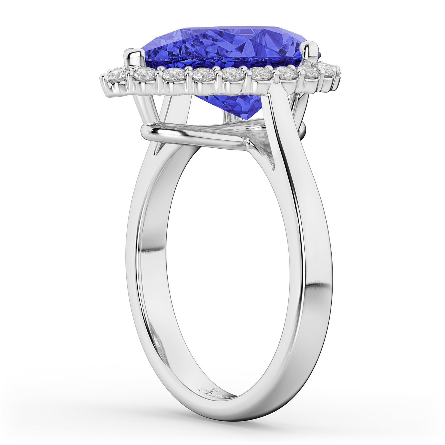 This eye-catching halo diamond ring features 0.44ct of accent diamonds surrounding a large, 7.90ct pear shaped, prong-set tanzanite, with a thin, smooth, 14k white gold band.