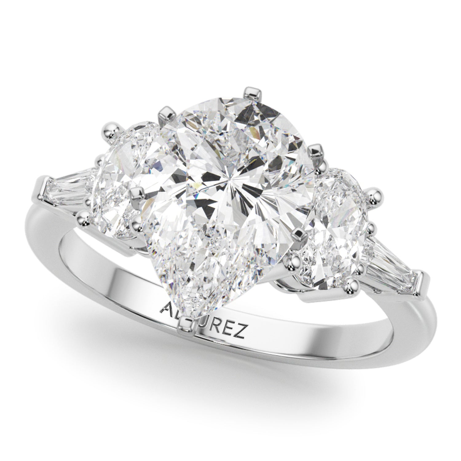 The centerpiece is a breathtaking 3-carat Pear lab grown diamond, surrounded by two oval 0.50-carat side stones (5.8x4.1mm) and two taper baguette 0.09-carat accent stones (4.02x1.5mm). And the exquisite Wedding Band piece showcases a stunning combination of a Straight Baguette (5x2.5), two radiant Oval stones (4x3), and two delicate Taper Baguettes (4x2x1.5)
