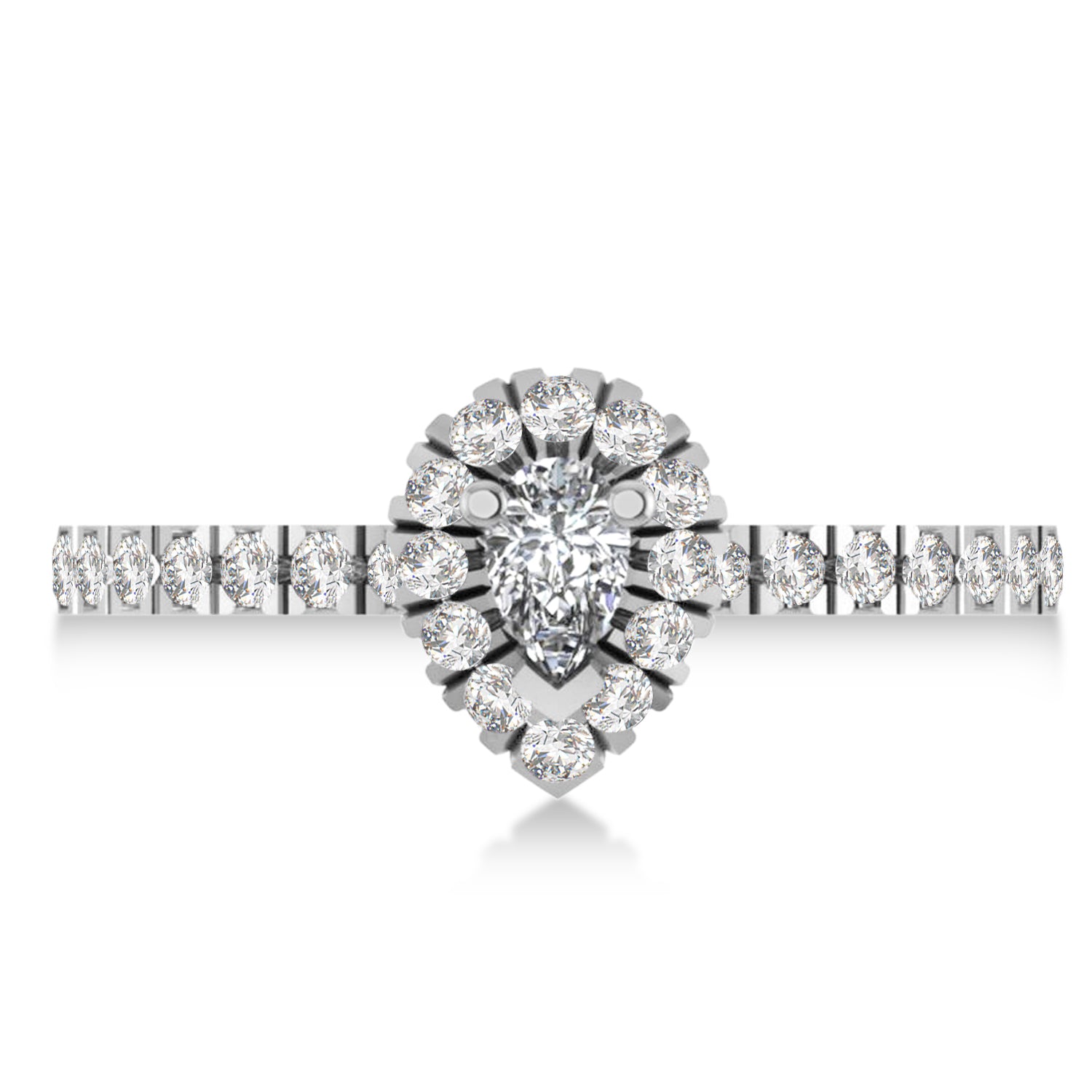 This eye-catching Lab Grown Diamond ring features 0.38ct total weight of encrusted diamonds on the thin 14k White Gold band, as well as surrounding a 1ct Pear cut Lab Grown Diamond.